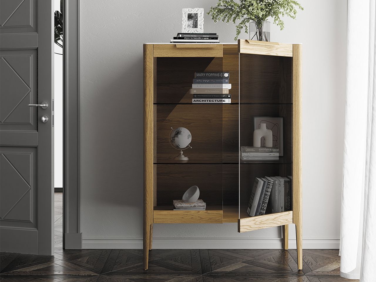 Изысканная витрина украсит интерьер дома и подчеркнёт вашу индивидуальность. Распашные фасады с гладкими серыми стёклами — главная особенность этого изделия, которая делает его уникальным. Две полки из калёного прозрачного стекла выдерживают сильные нагрузки, что позволит разместить внутри витрины книги, посуду или другие предметы декора.