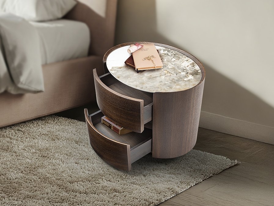Овальный ночной столик с двумя ящиками на направляющих. Изготовлен из фанеры с отделкой под тёмный дуб. Столешница из фарфора с отделкой под мрамор с прожилками.