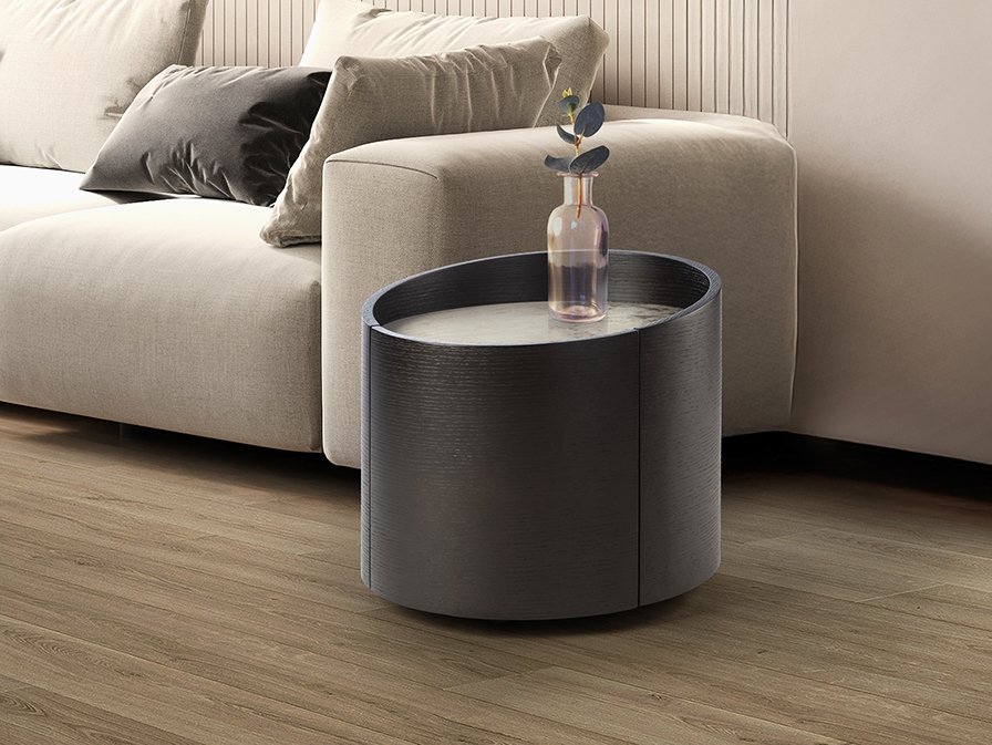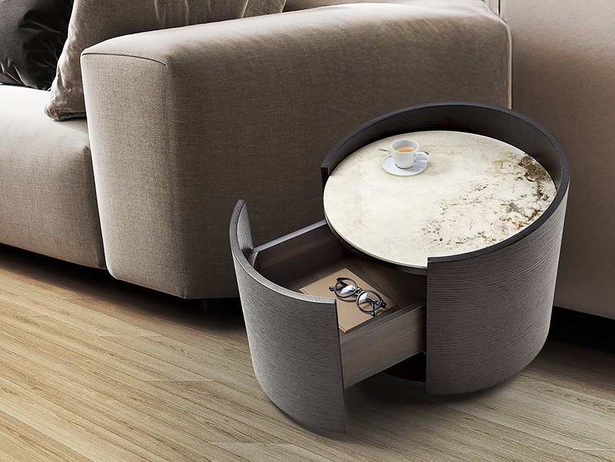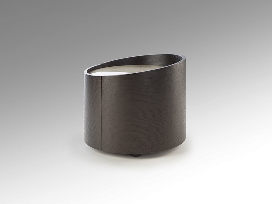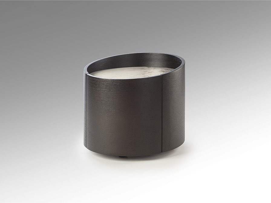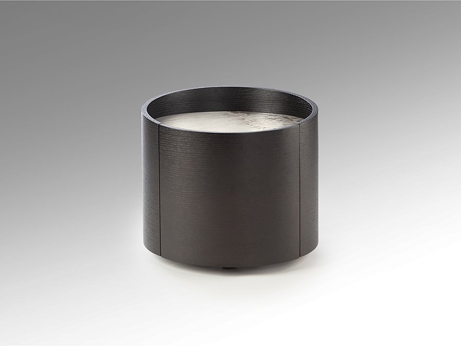 Круглый ночной столик с двумя ящиками на направляющих. Изготовлен из фанеры чёрного дуба. Столешница из фарфора с отделкой под мрамор с прожилками.