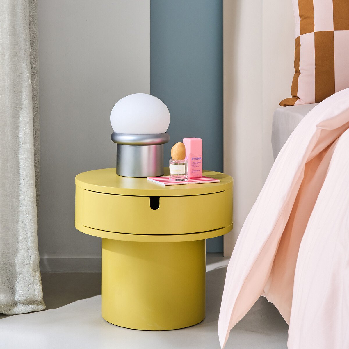 Прикроватная тумбочка Tamita / Тамита входит в коллекцию Signatures / Сигнатюр La Redoute Intérieurs. Подборка эксклюзивных изделий, созданных нашими дизайнерами.Вдохновляющие, практичные, стильные... эти изделия обожают наши покупатели. И, без сомнений, полюбятся вам. Собственный дизайн от Адриана Эделя:Маленький формат, большое впечатление !Tamita / Тамита — прикроватная тумбочка, которая выделяется из общей массы своей круглой формой. Она сочетает в себе компактные размеры, место для хранения и современный дизайн.Описание • Один ящик • Каркас и основание из МДФ и лакированной сосны, матовая отделка • Покрытие нитроцеллюлозным лакомРазмерыОбщие размеры • Диаметр столешницы: 39 см • Диаметр ножки: 26 см • Высота: 34 см • Вес: 14 кгВнутренние размеры • Ящик: Д26 x В6,3 x Г25,5 смДоставкаПродается в собранном виде. Доставка осуществляется до квартиры по предварительной договоренности. Внимание! Убедитесь в том, что товар можно доставить на дом с учётом его габаритов (проходит в двери, по лестницам, в лифты). • ДРЕВЕСИНА ИЗ УСТОЙЧИВО УПРАВЛЯЕМЫХ ЛЕСОВ. Наличие знака FSC® означает, что древесина, из которой изготовлено изделие, добыта с соблюдением международных стандартов: в процессе добычи не были нарушены права коренных народов, местных жителей и работников, и заготовка велась методом устойчивого лесопользования.Размеры и вес упаковкиОдна упаковка • Д49 x В43 x Г49 см, 17 кг
