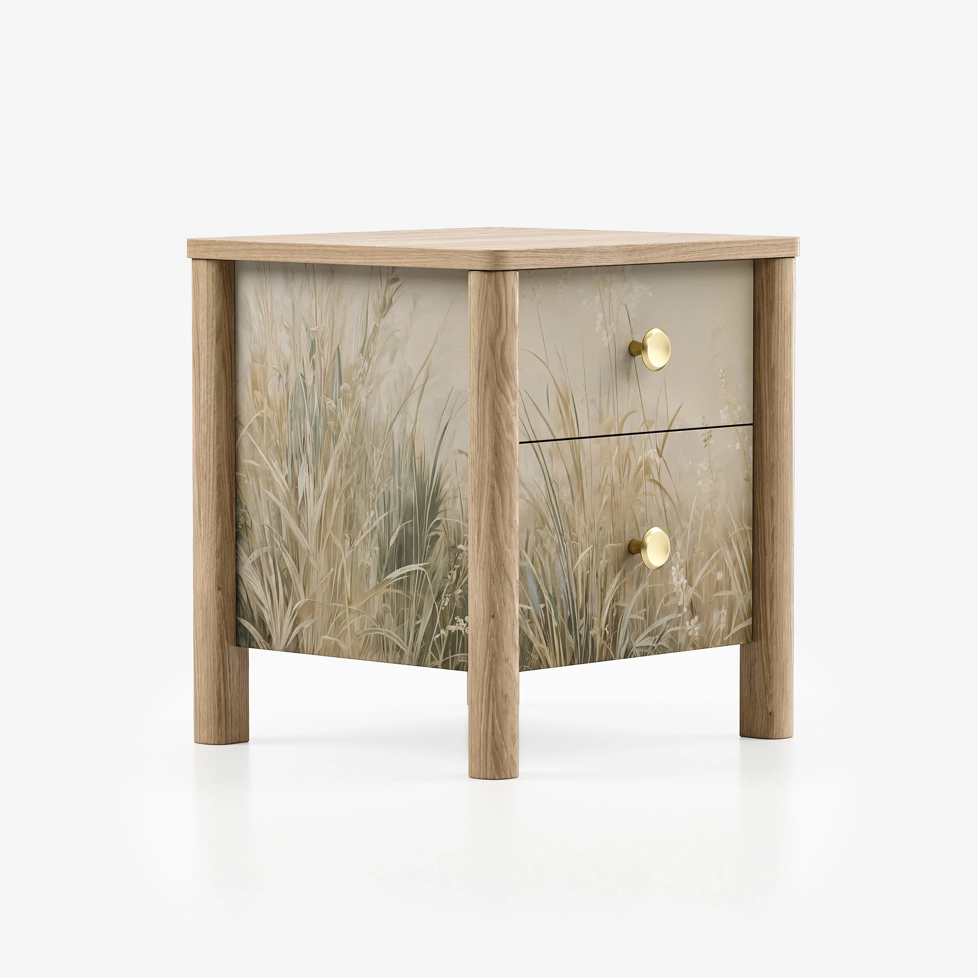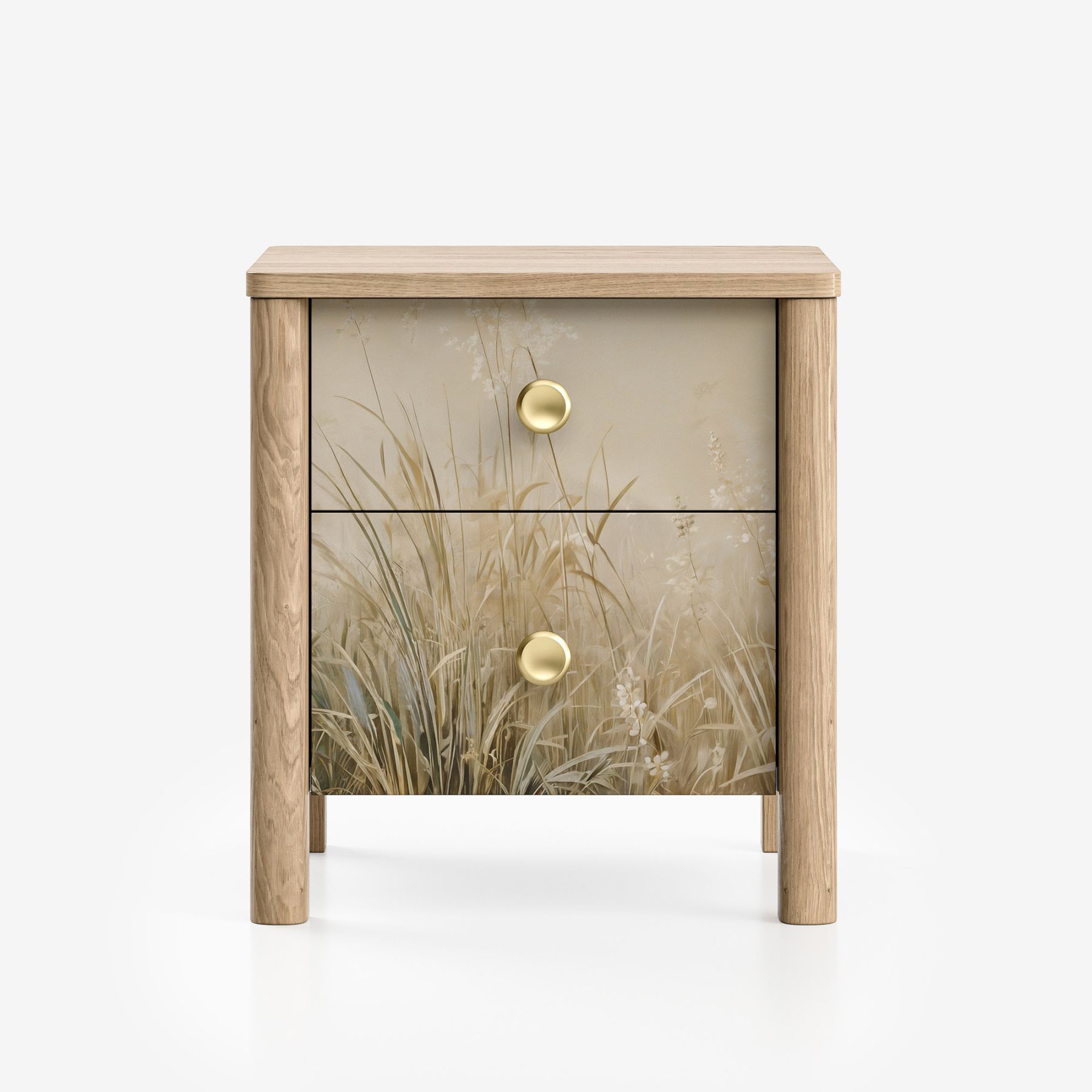 Два выдвижных ящика с плавными доводчиками и массивными ручками, каплевидная форма ножек, скругленные углы столешницы — мы позаботились о том, чтобы архитектура этого ассоциировалась с плавными природными формами и привносила гармонию в вашей спальне.