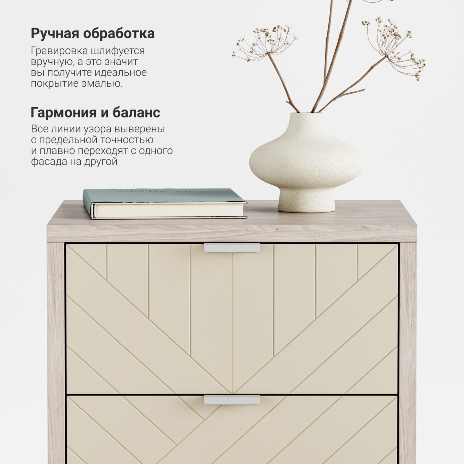 Основание и ножки из массива дуба. Корпус и фасады на ваш выбор: прочная эмаль с уникальной гравировкой или благородный натуральный шпон дуба.