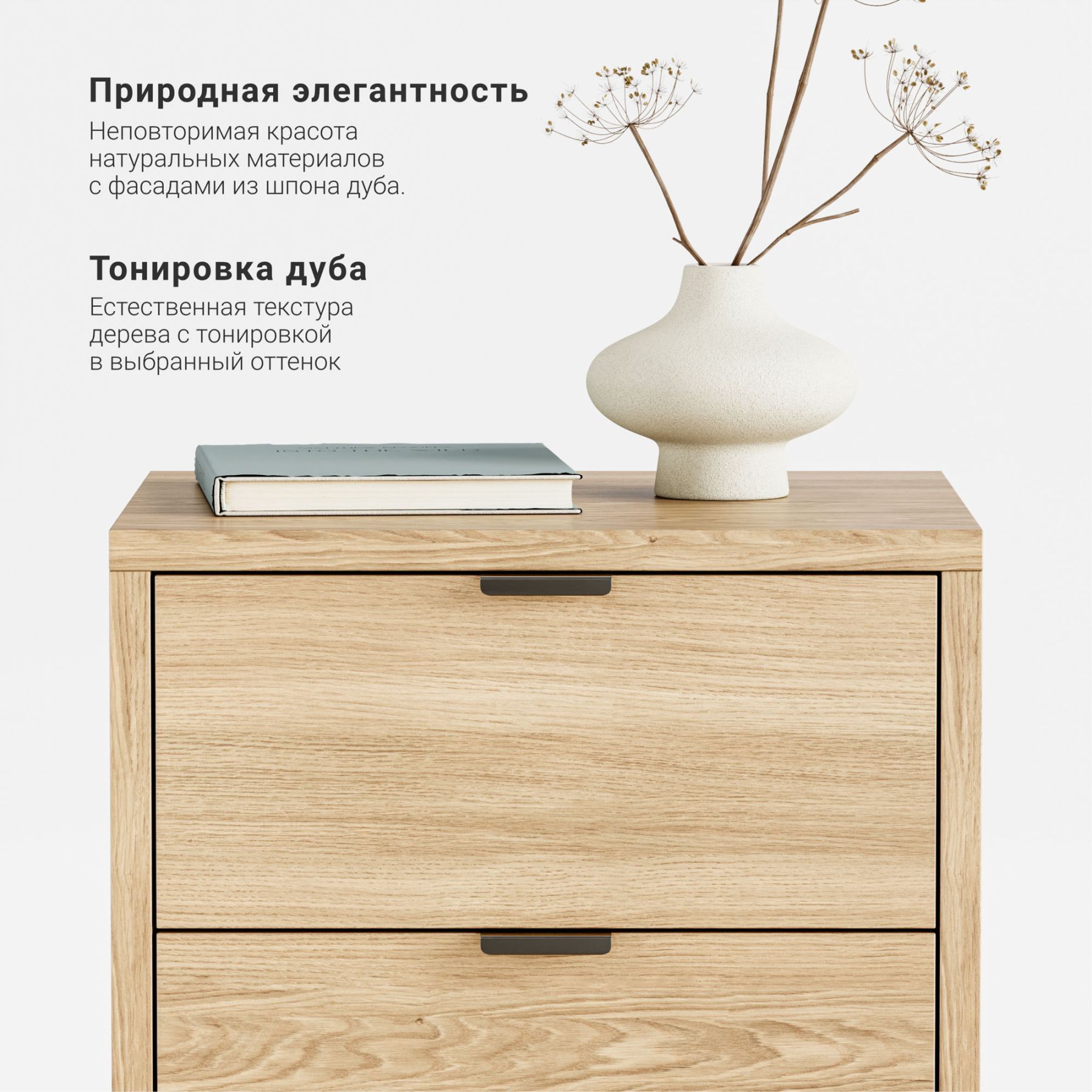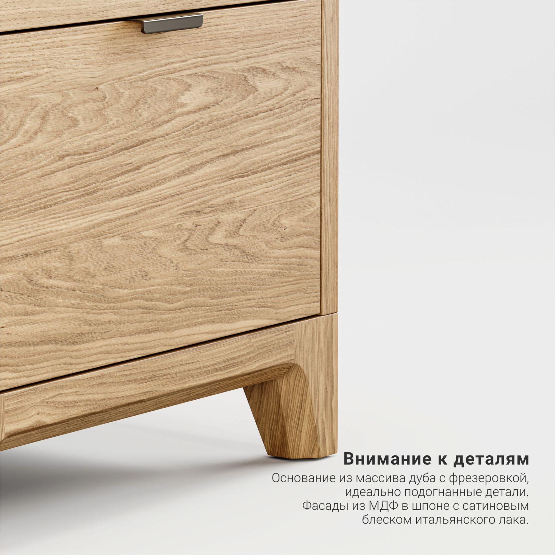 Основание и ножки из массива дуба. Корпус и фасады на ваш выбор: прочная эмаль с уникальной гравировкой или благородный натуральный шпон дуба.