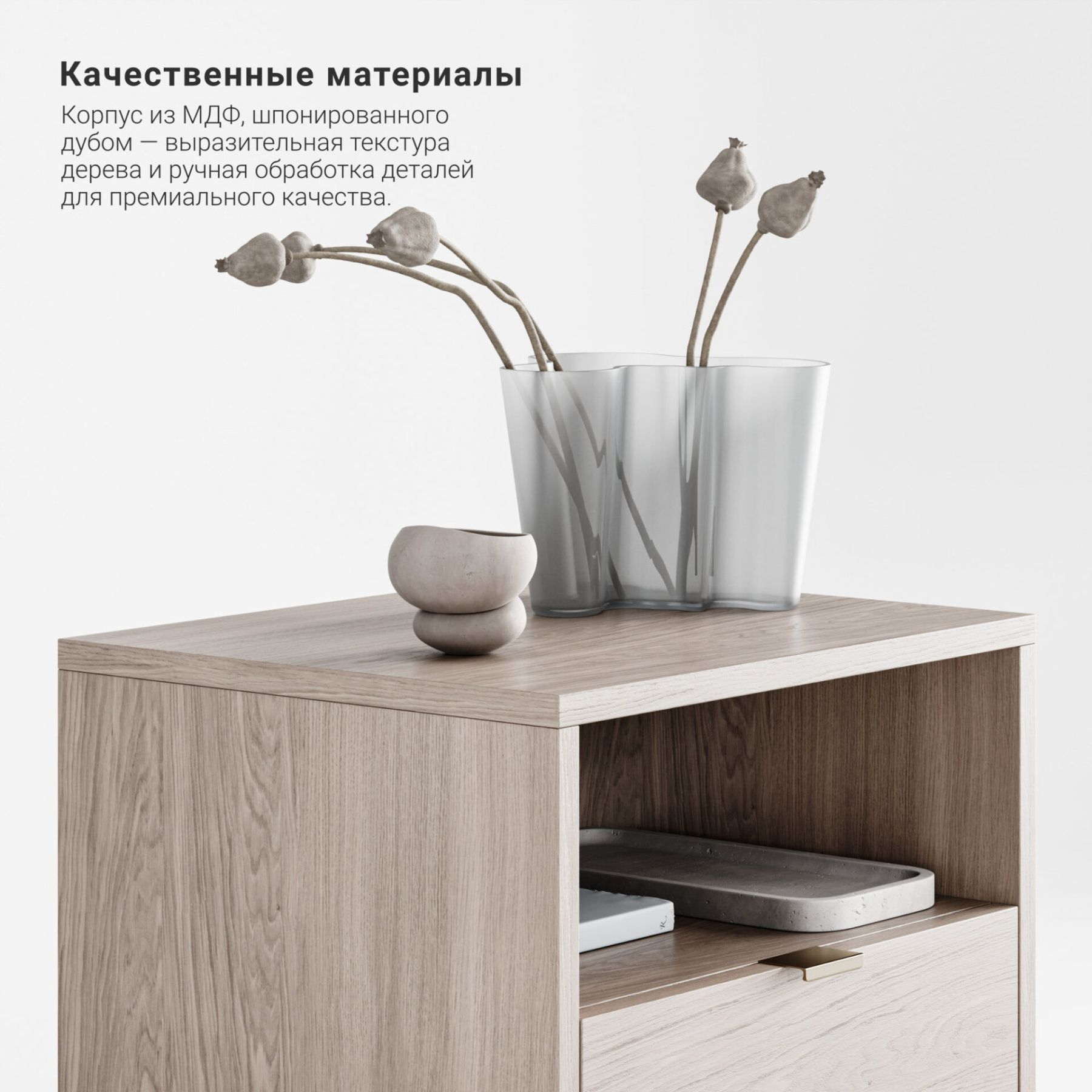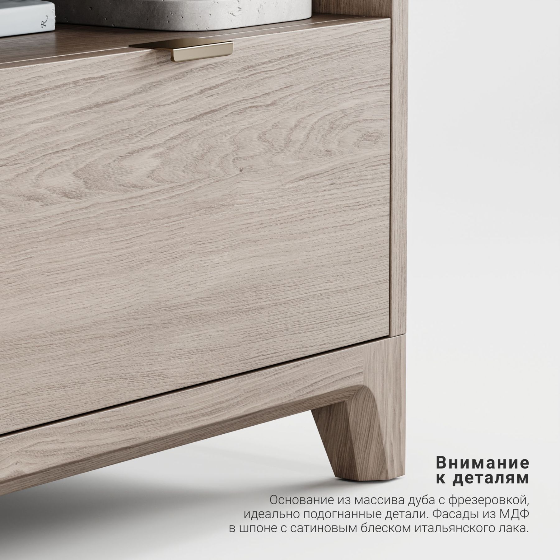 Основание и ножки из массива дуба. Корпус и фасады на ваш выбор: прочная эмаль с уникальной гравировкой или благородный натуральный шпон дуба.