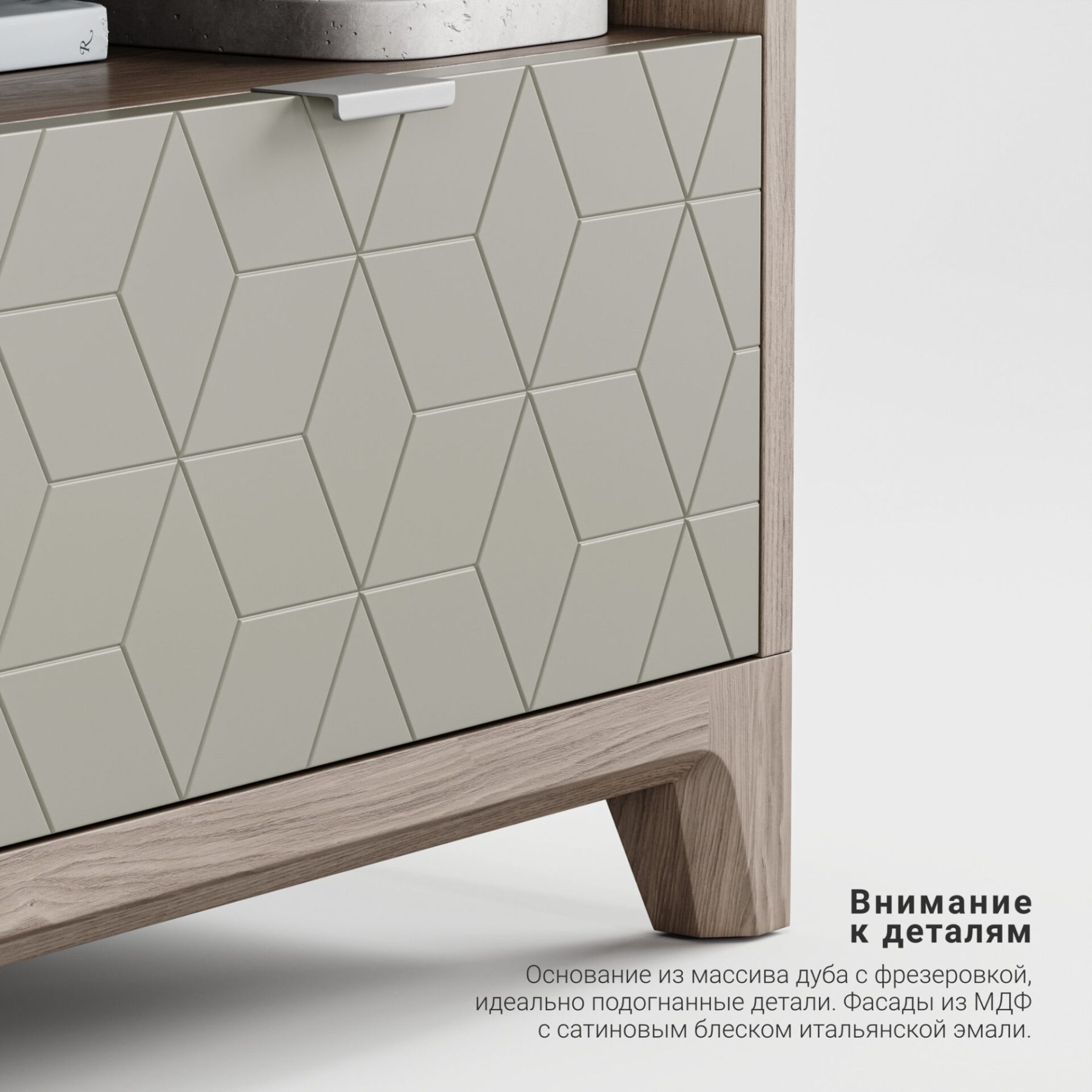 Основание и ножки из массива дуба. Корпус и фасады на ваш выбор: прочная эмаль с уникальной гравировкой или благородный натуральный шпон дуба.