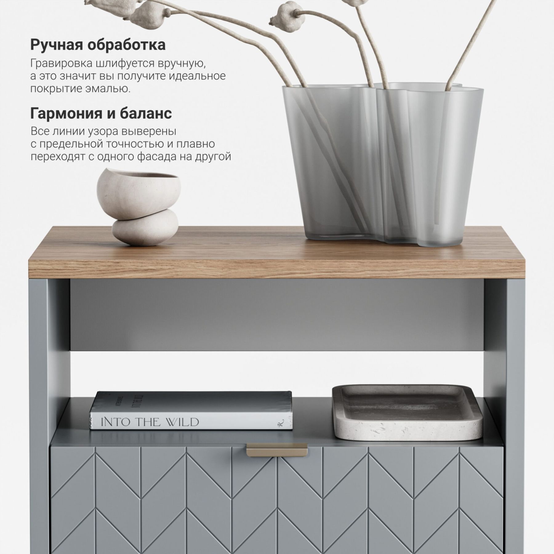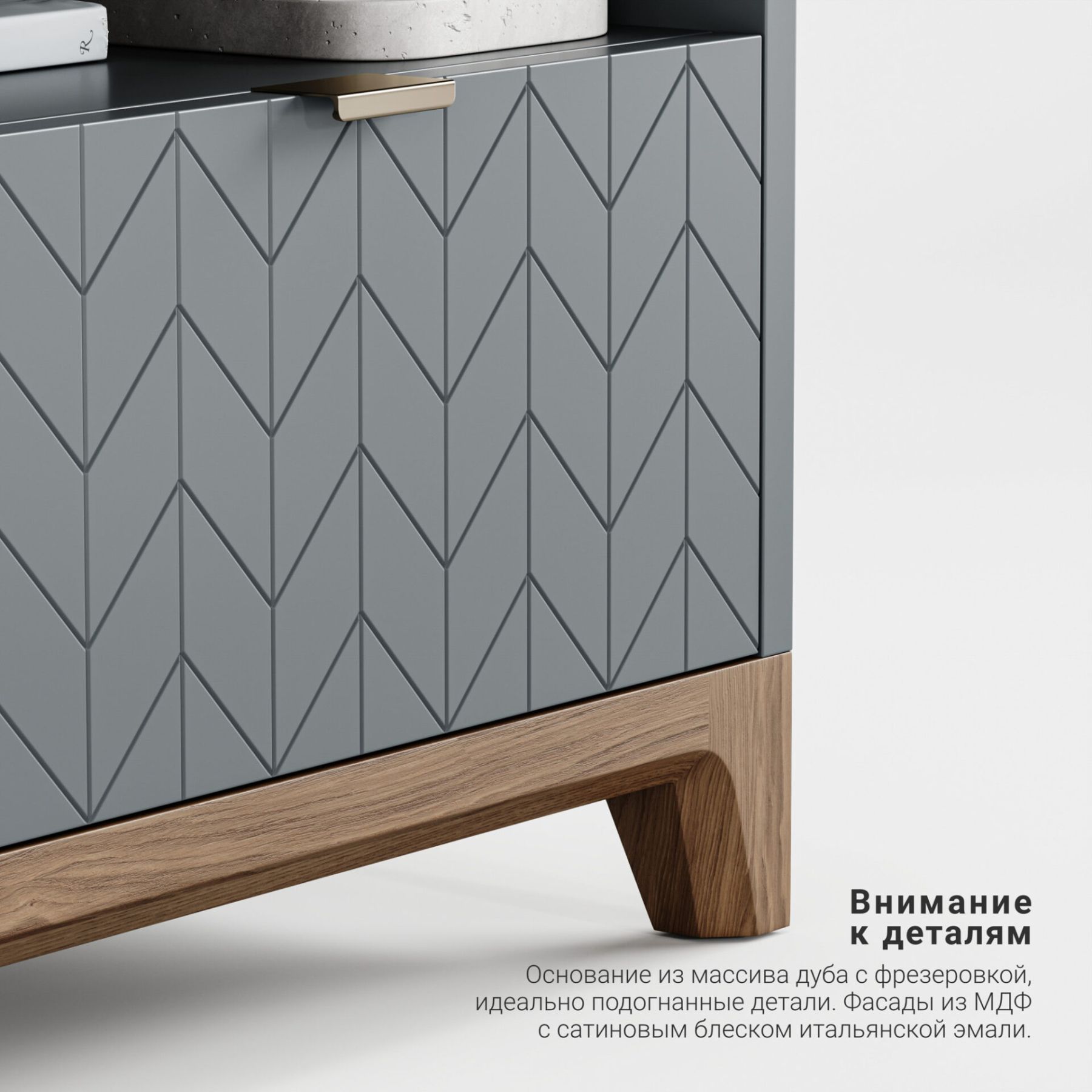 Основание и ножки из массива дуба. Корпус и фасады на ваш выбор: прочная эмаль с уникальной гравировкой или благородный натуральный шпон дуба.