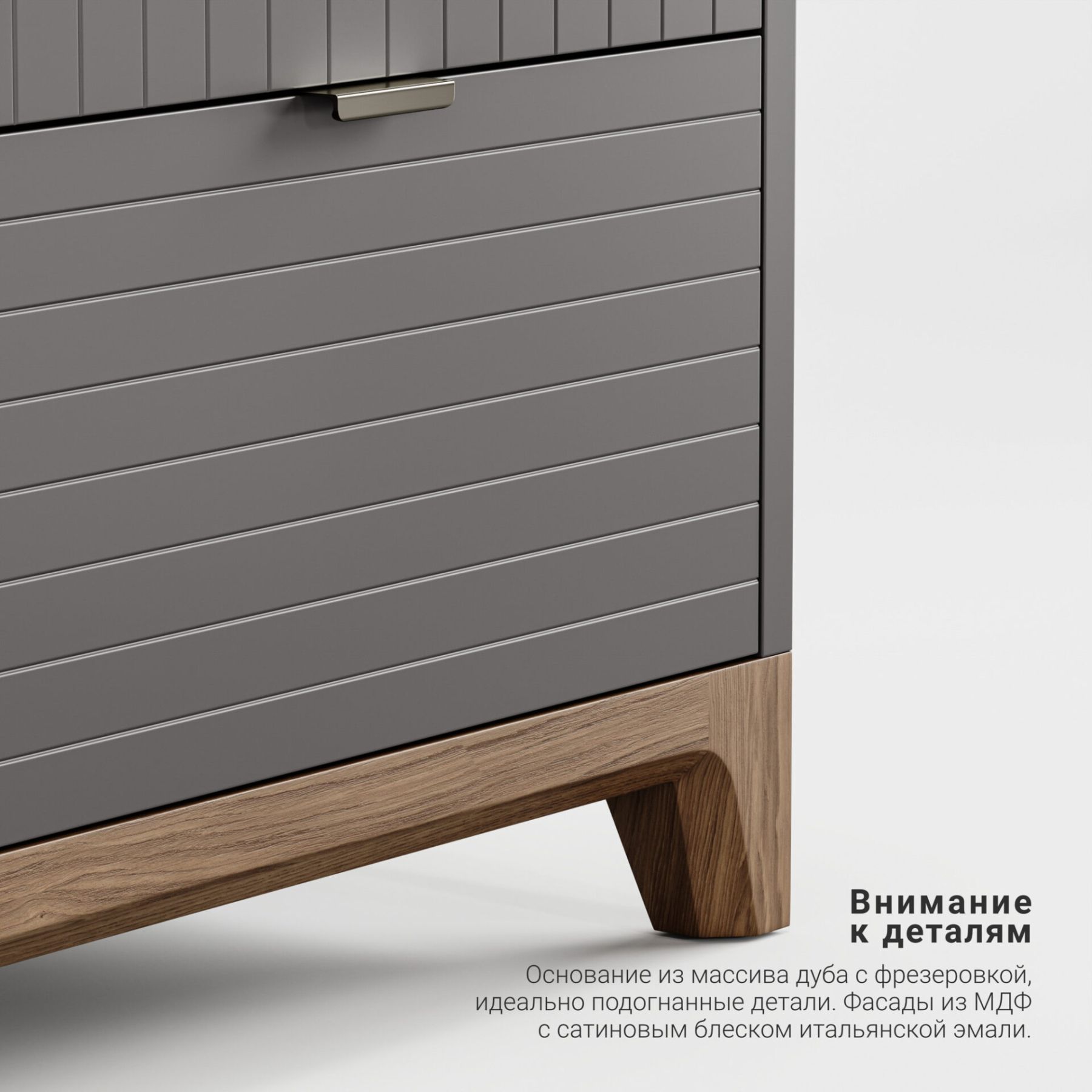 Основание и ножки из массива дуба. Корпус и фасады на ваш выбор: прочная эмаль с уникальной гравировкой или благородный натуральный шпон дуба.