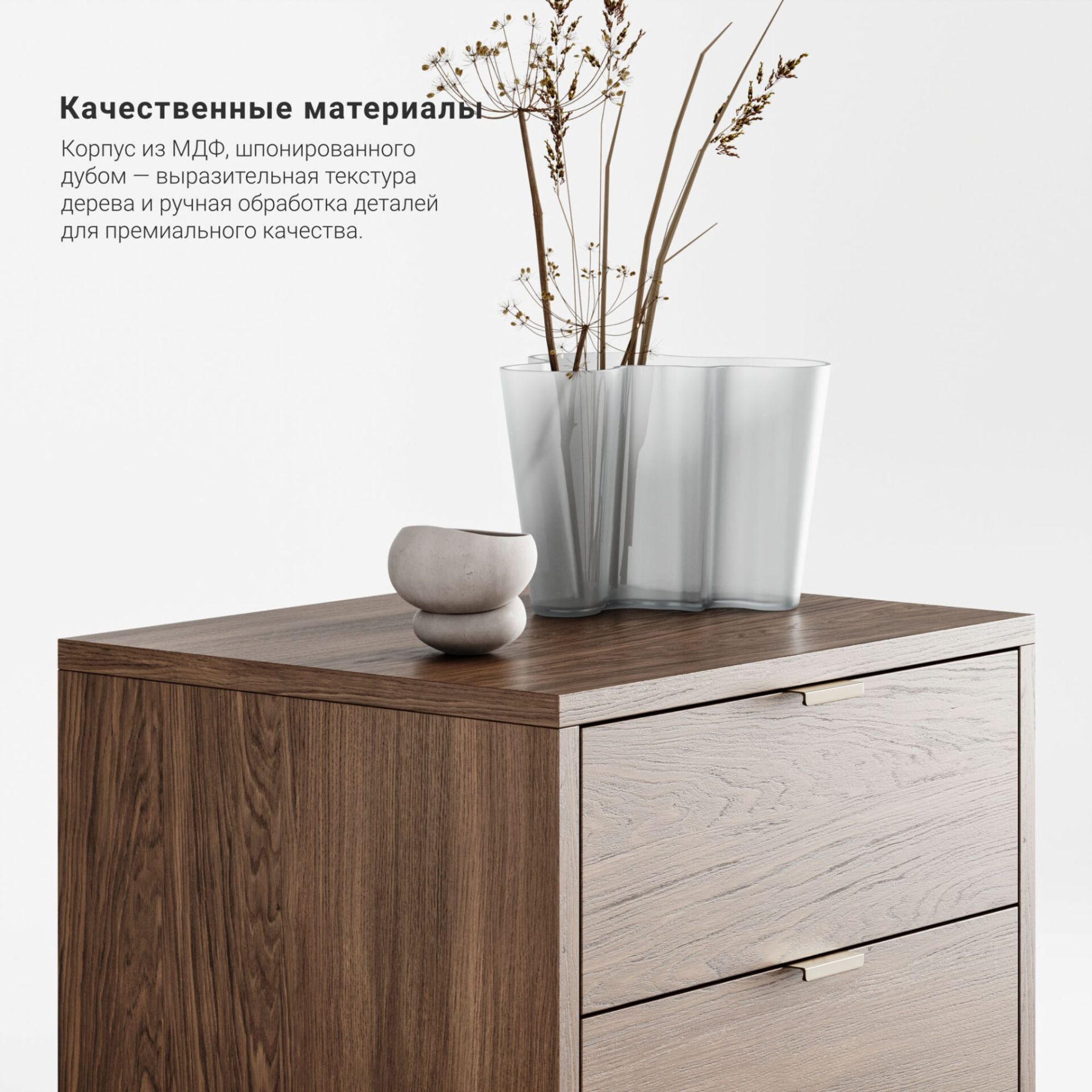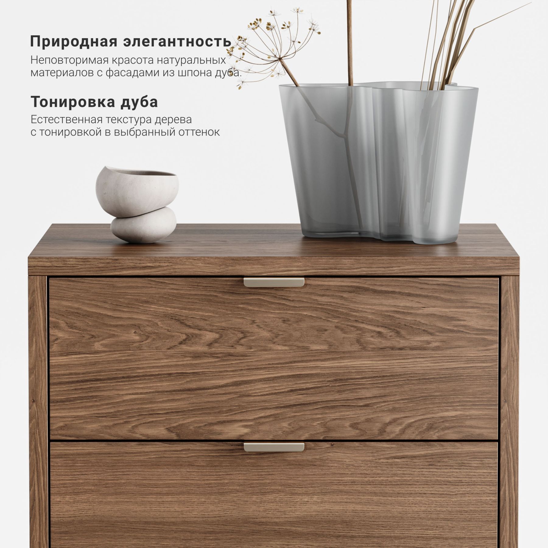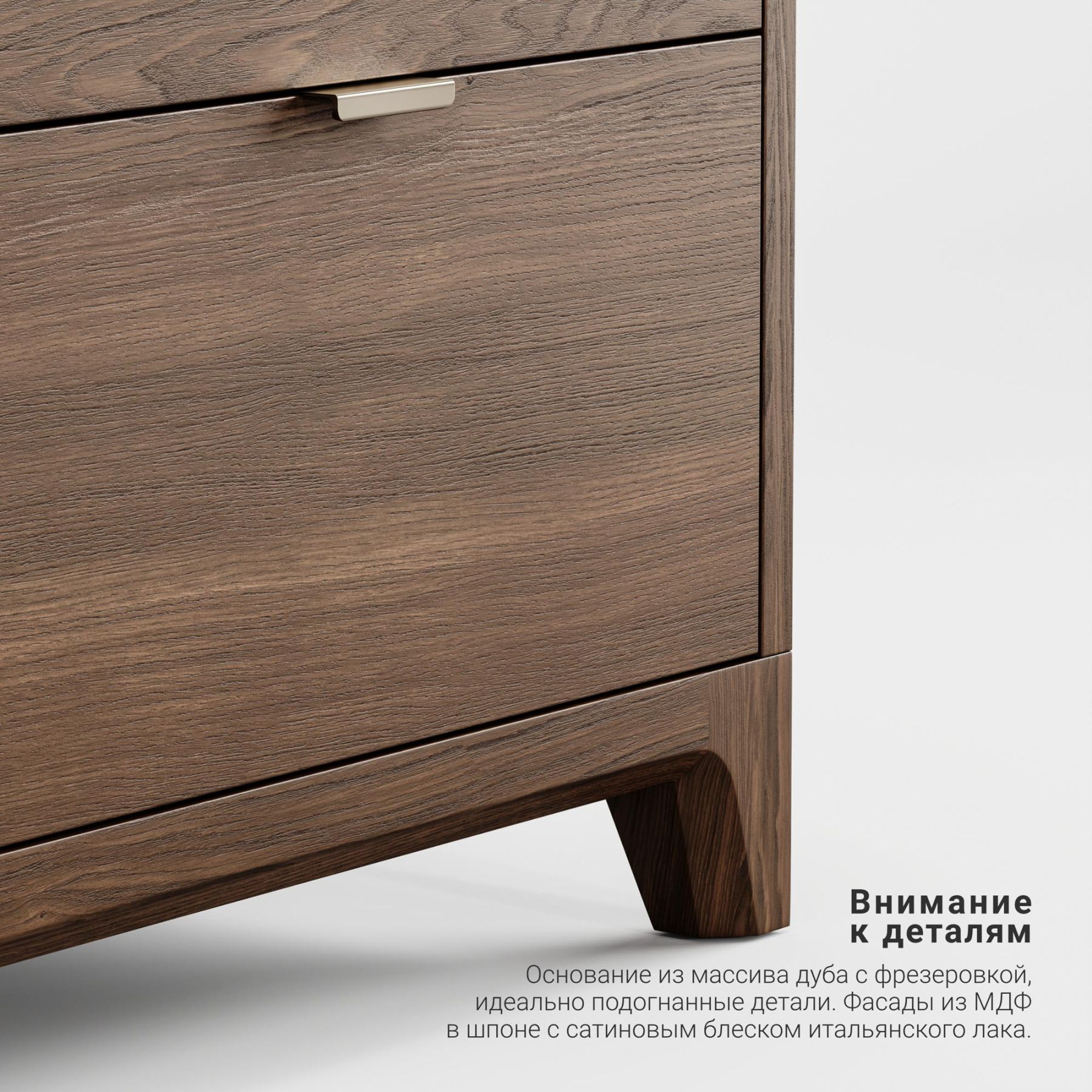 Основание и ножки из массива дуба. Корпус и фасады на ваш выбор: прочная эмаль с уникальной гравировкой или благородный натуральный шпон дуба.