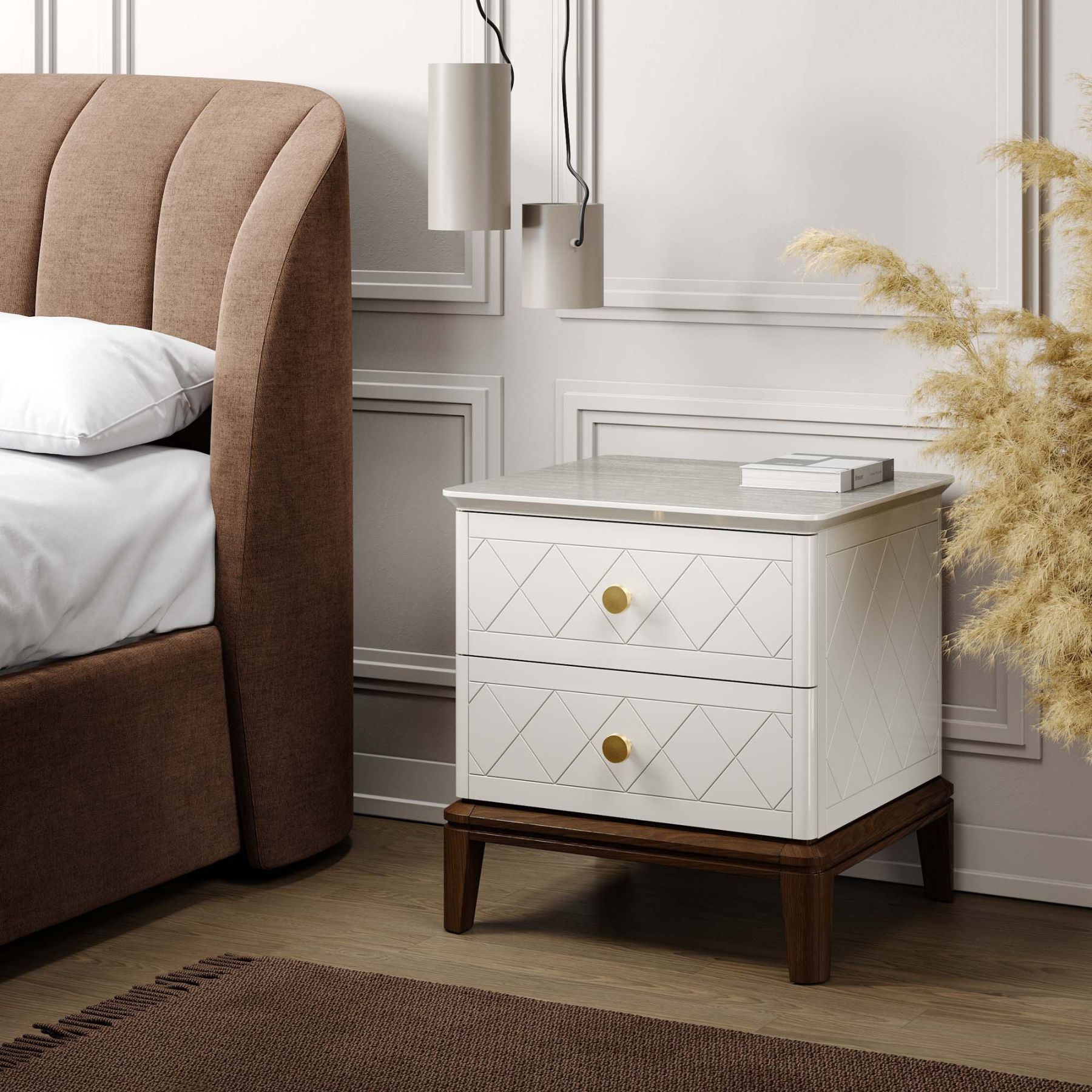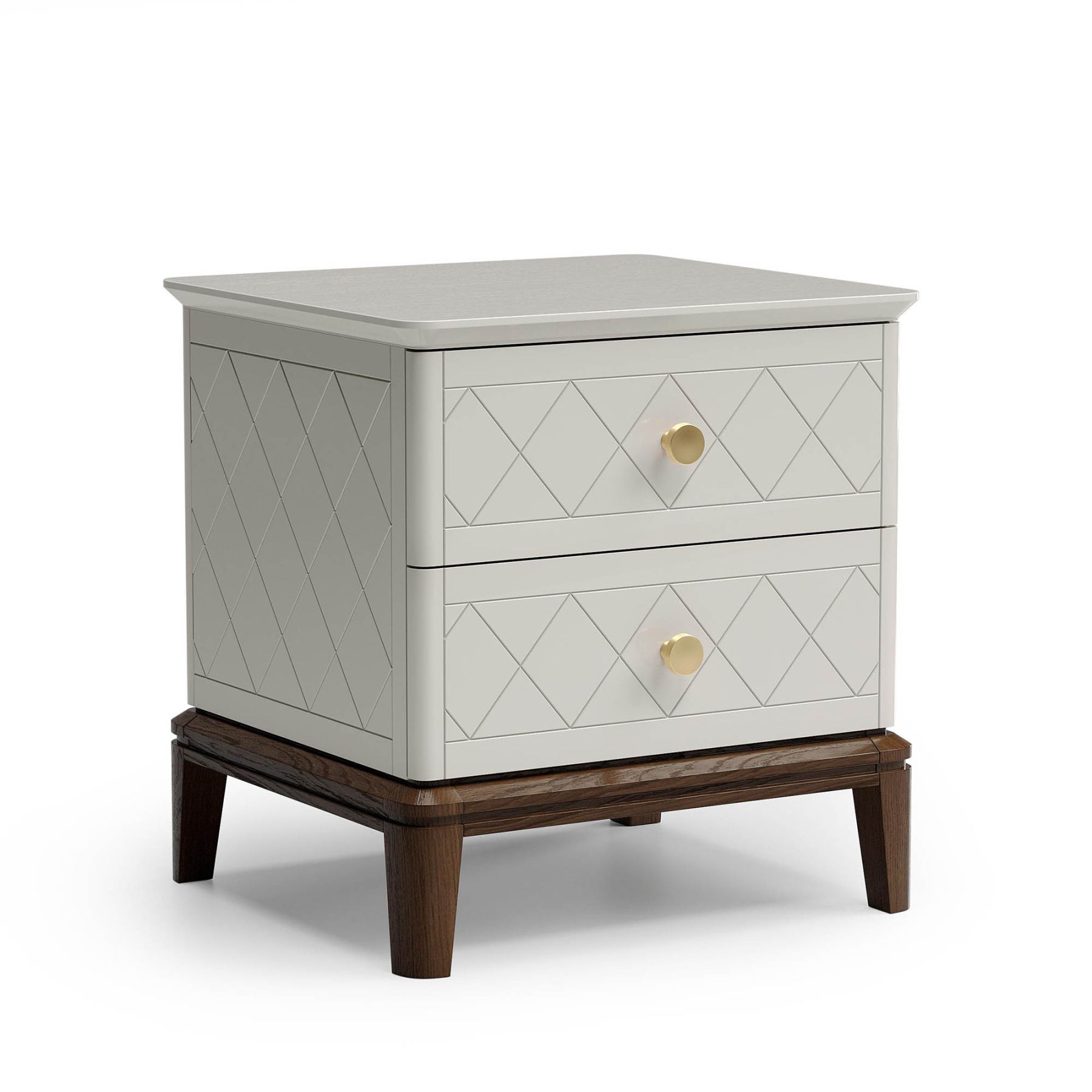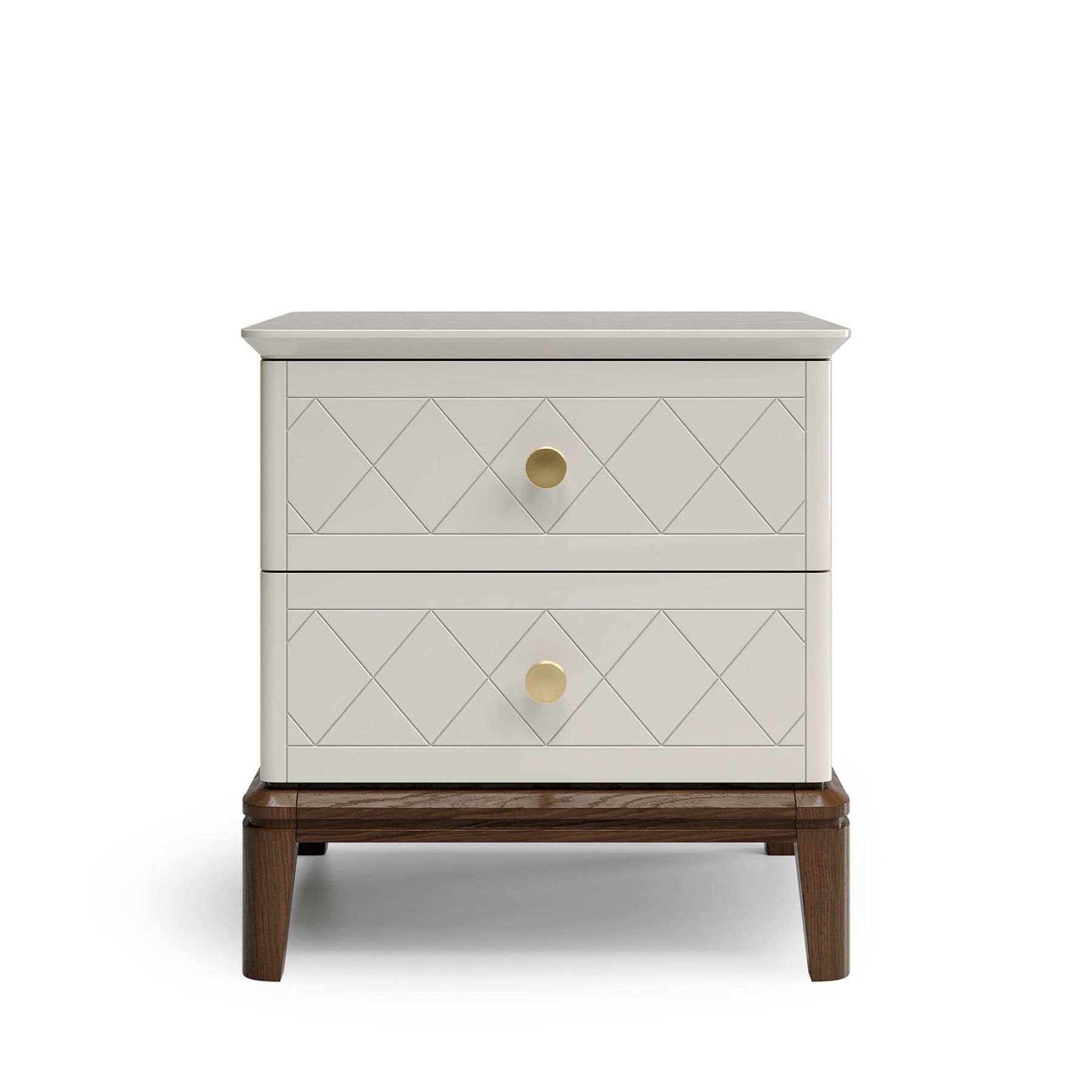 Будущее украшение вашей спальни — прикроватная тумба, которая привлекает внимание, несмотря на свои компактные габариты. Узнаваемые элементы современной классики — золотые детали, изящная ступенчатая фрезеровка основания и столешницы, придающая тумбе узнаваемый силуэт стиля. Еще одна особенность — трехсторонняя гравировка, переходящая с фасада на боковые стенки, завершает композицию.