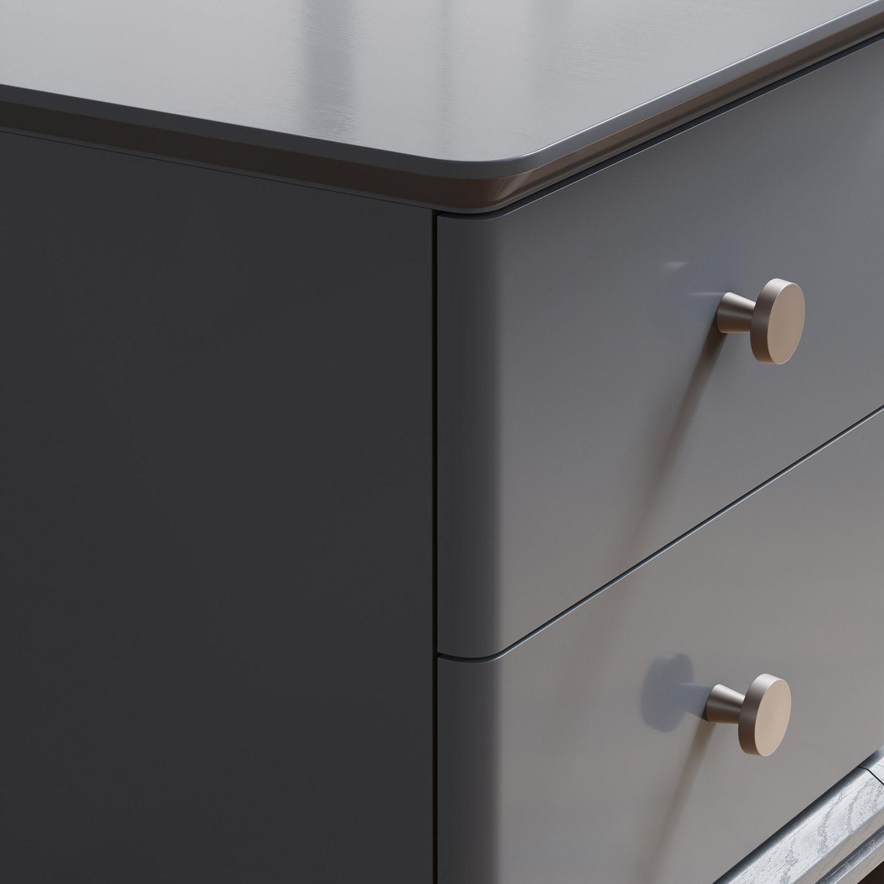 Будущее украшение вашей спальни — прикроватная тумба, которая привлекает внимание, несмотря на свои компактные габариты. Узнаваемые элементы современной классики — золотые детали, изящная ступенчатая фрезеровка основания и столешницы, придающая тумбе узнаваемый силуэт стиля. Еще одна особенность — трехсторонняя гравировка, переходящая с фасада на боковые стенки, завершает композицию.