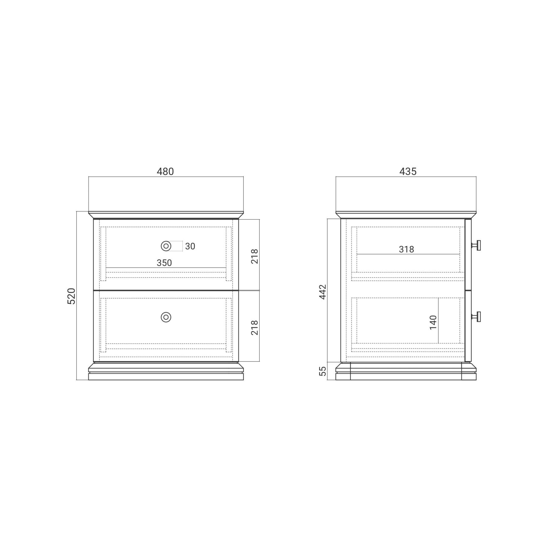 Тумба оснащена двумя ящиками для хранения, которые украшают массивные ручки в стильной отделке. Цоколь из массива дуба обрабатываются вручную: их многогранные очертания — результат кропотливой работы наших специалистов.