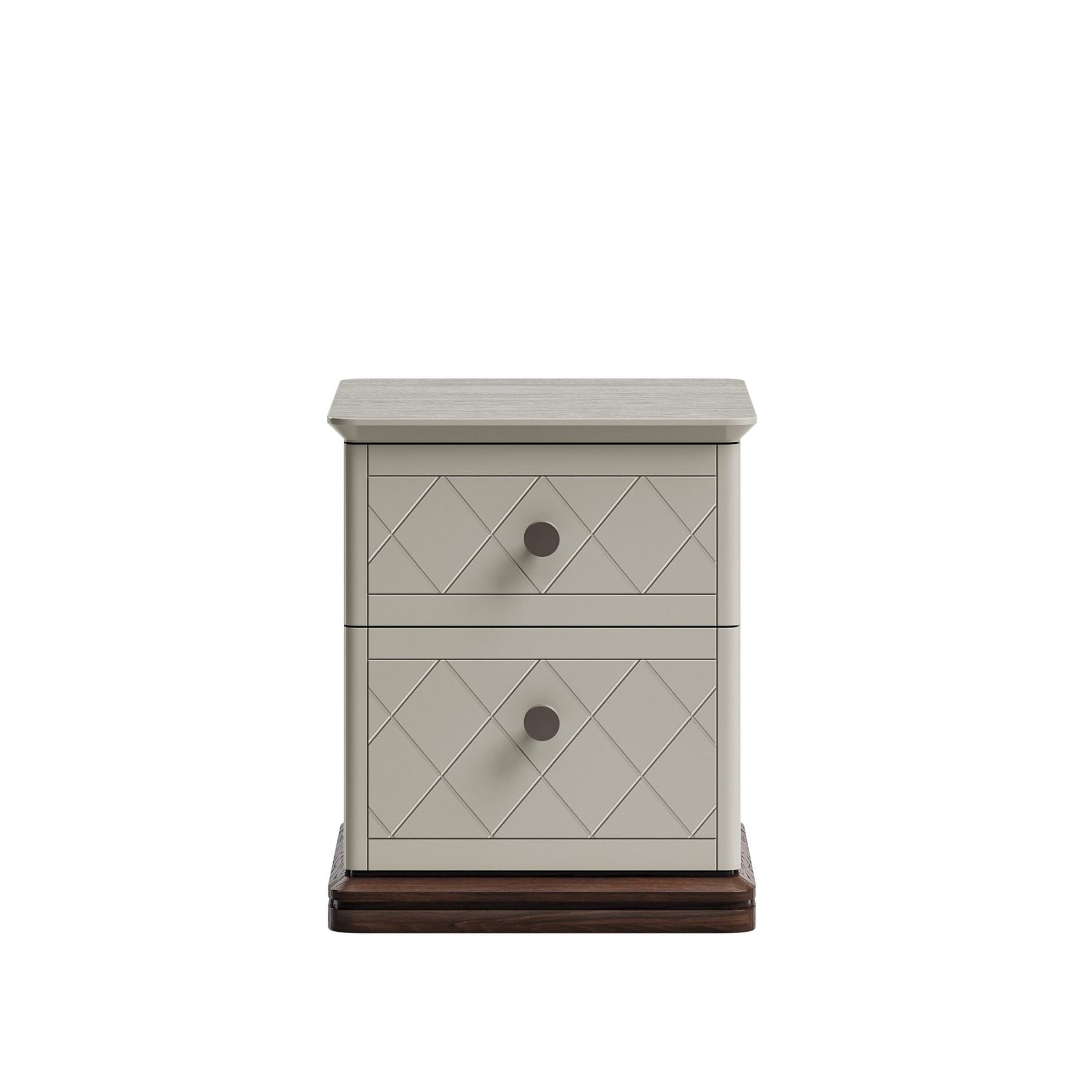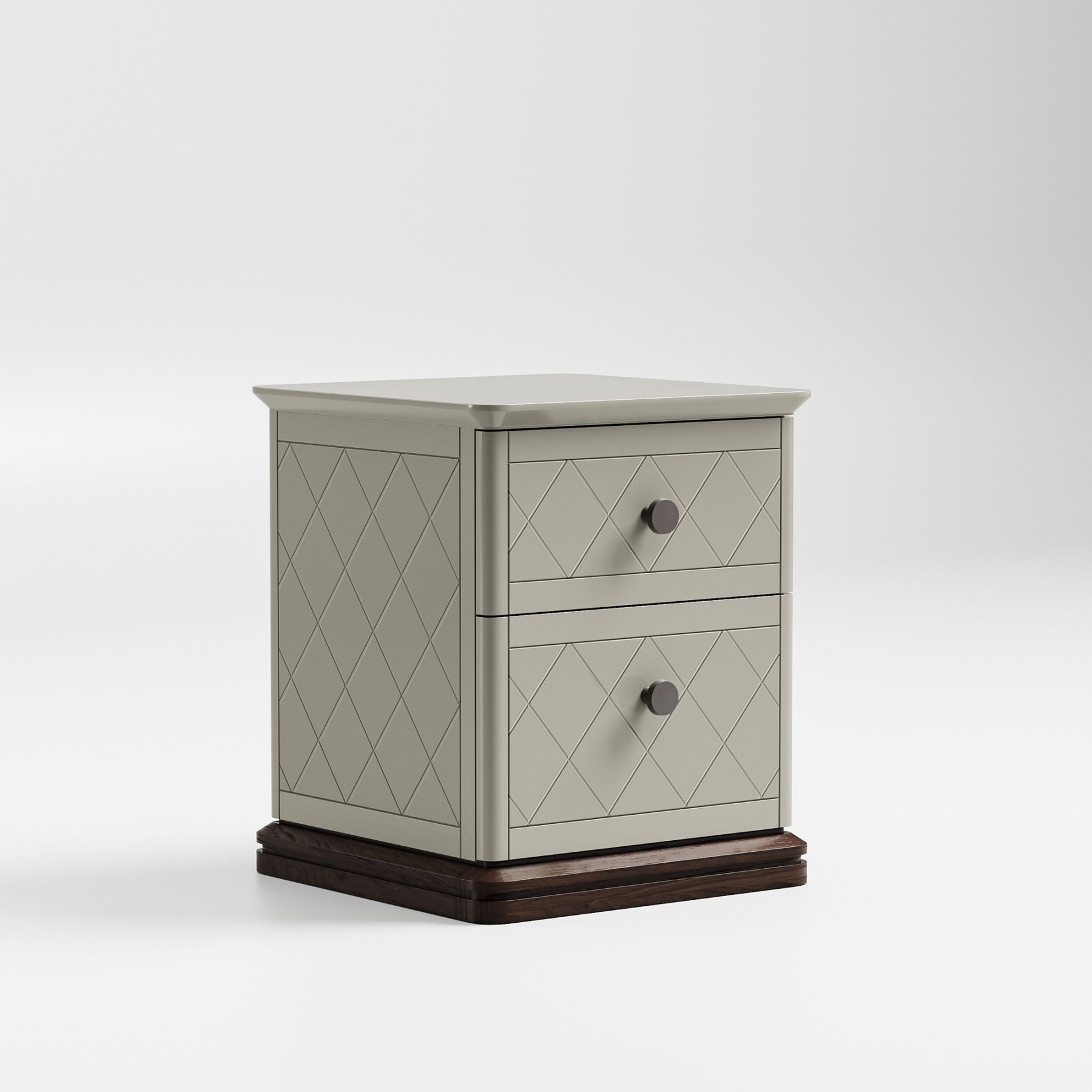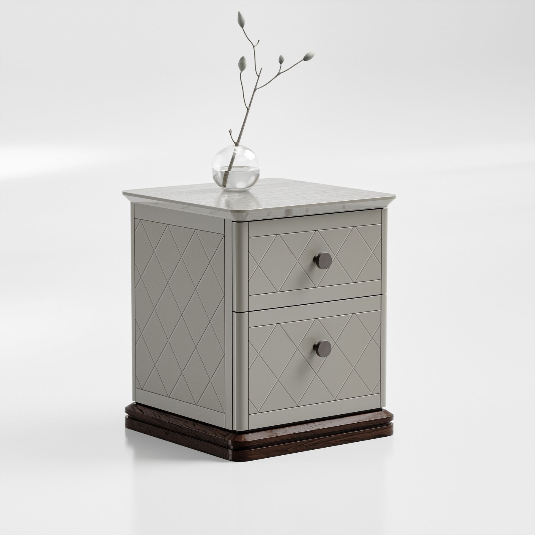 Будущее украшение вашей спальни — прикроватная тумба, которая привлекает внимание, несмотря на свои компактные габариты. Узнаваемые элементы современной классики — золотые детали, изящная ступенчатая фрезеровка основания и столешницы, придающая тумбе узнаваемый силуэт стиля. Еще одна особенность — трехсторонняя гравировка, переходящая с фасада на боковые стенки, завершает композицию.