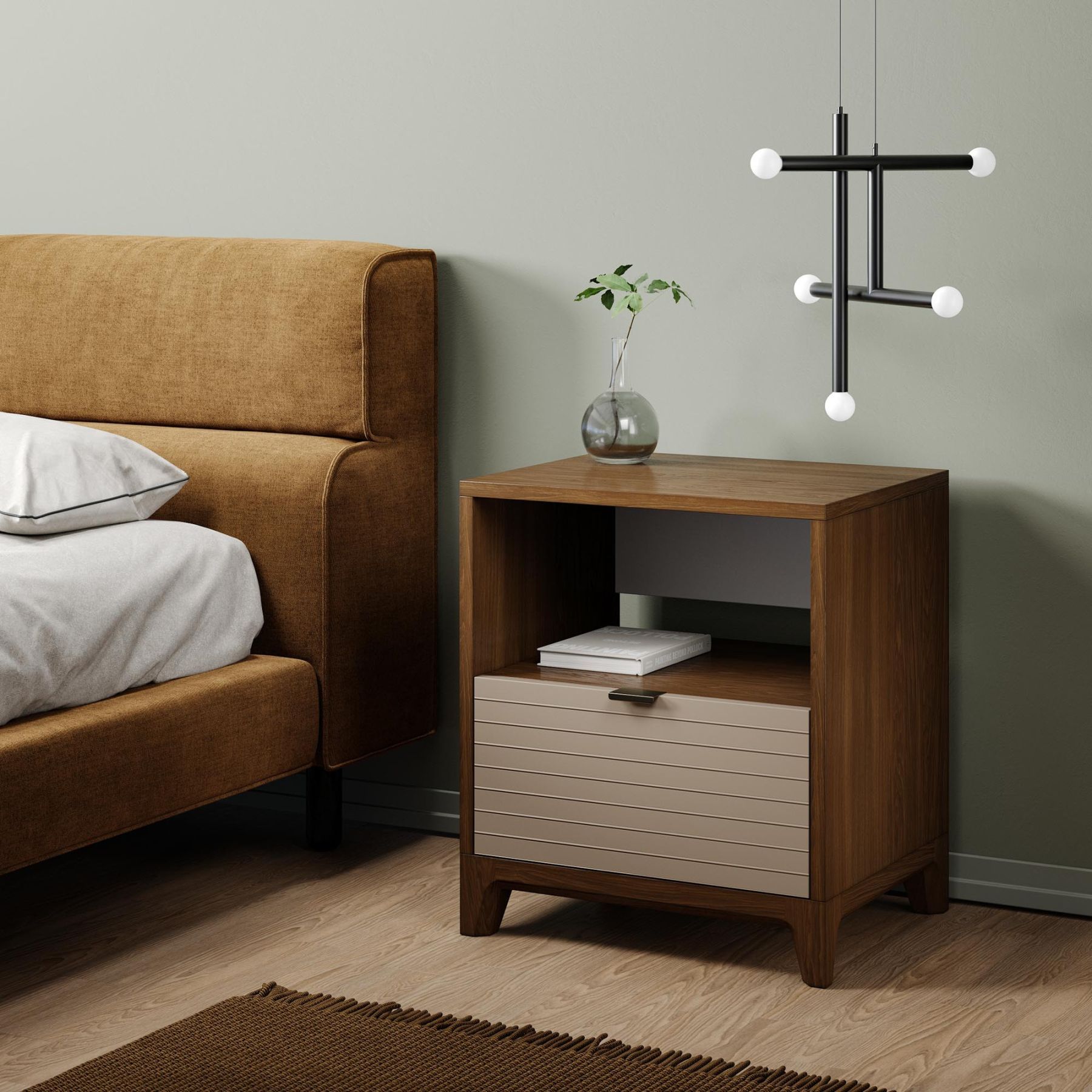 Основание и ножки выполнены из массива дуба, цвет которого вы можете выбрать из 7 вариантов. Корпус тумбы может быть покрыт эмалью или натуральным шпоном дуба. Фасады могут быть покрыты эмалью с / без гравировки или натуральным шпоном дуба.