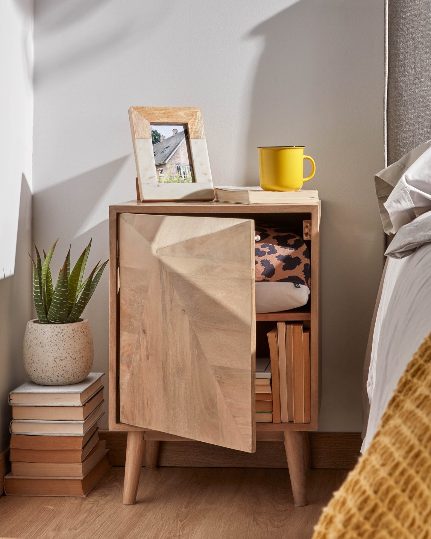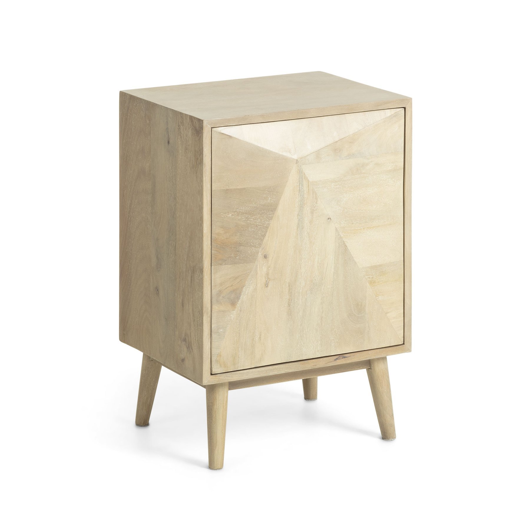 Прикроватная тумба Sanvy – станет настоящей «изюминкой» для вашей обстановки в спальной комнате. Она полностью сделана из натуральной древесины, которая здесь демонстрирует всю свою многогранность тонов зерен и вершин. Геометрия переднего фасада еще больше усиливает визуальный эффект. Вам непременно захочется рассматривать поверхность снова и снова. Ценить и любоваться природной красотой можно дома. Пусть тумба Sanvy будет рядом с вами!