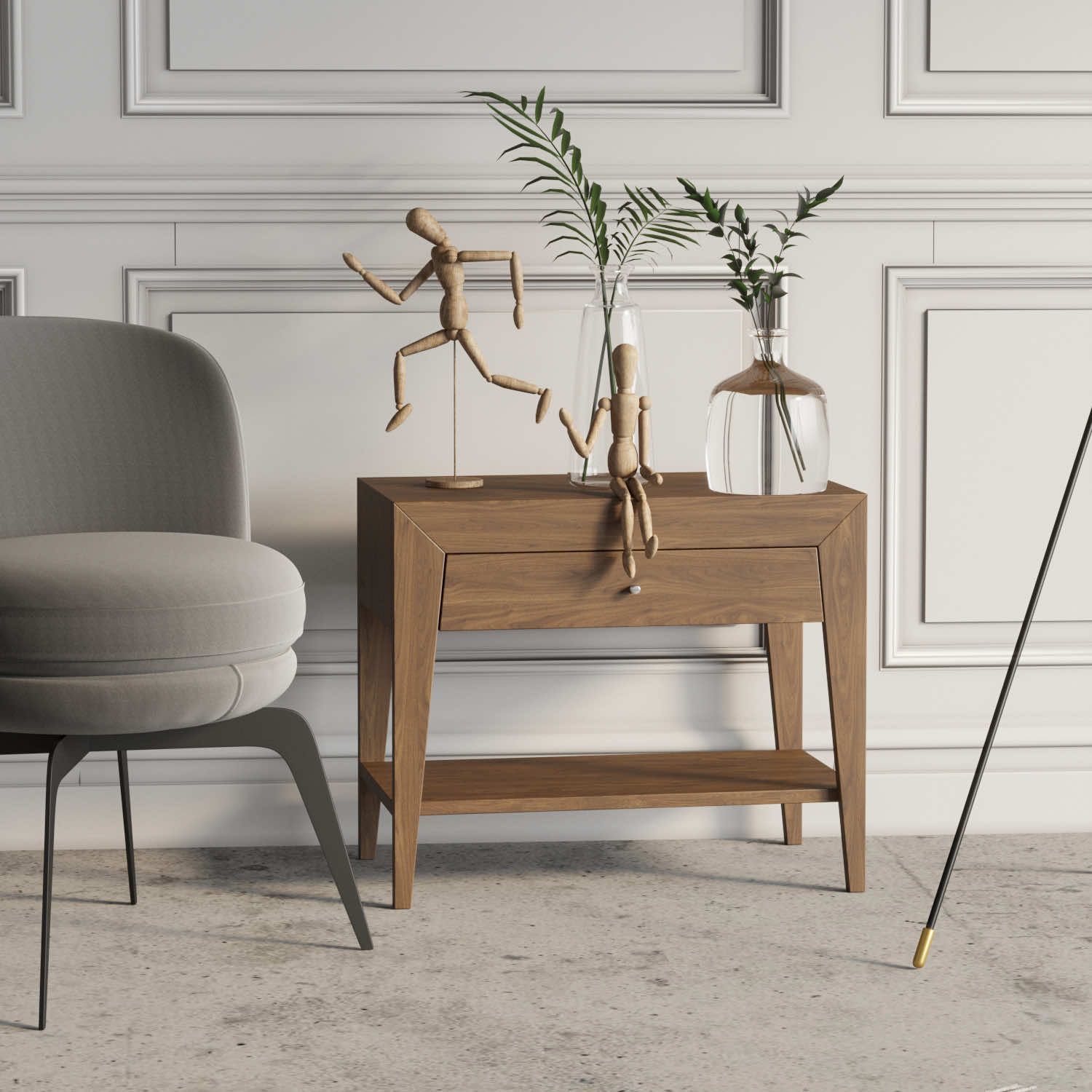 Тумба отличается необычным дизайном и функциональностью. Она оснащена одним выдвижным ящиком и полкой. Темная тонировка