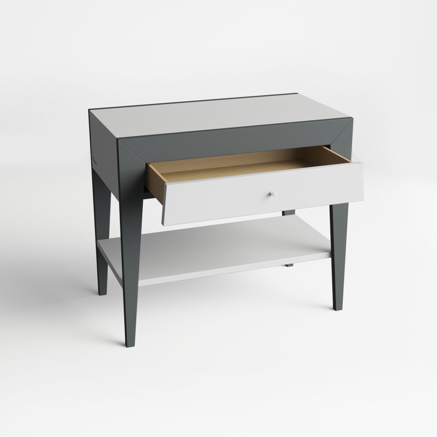 Тумба отличается необычным дизайном и функциональностью. Тумба оснащена одним выдвижным ящиком и одной полочкой Корпус-эмаль светло-серая ral 7047,ножки-эмаль серая ral 7012