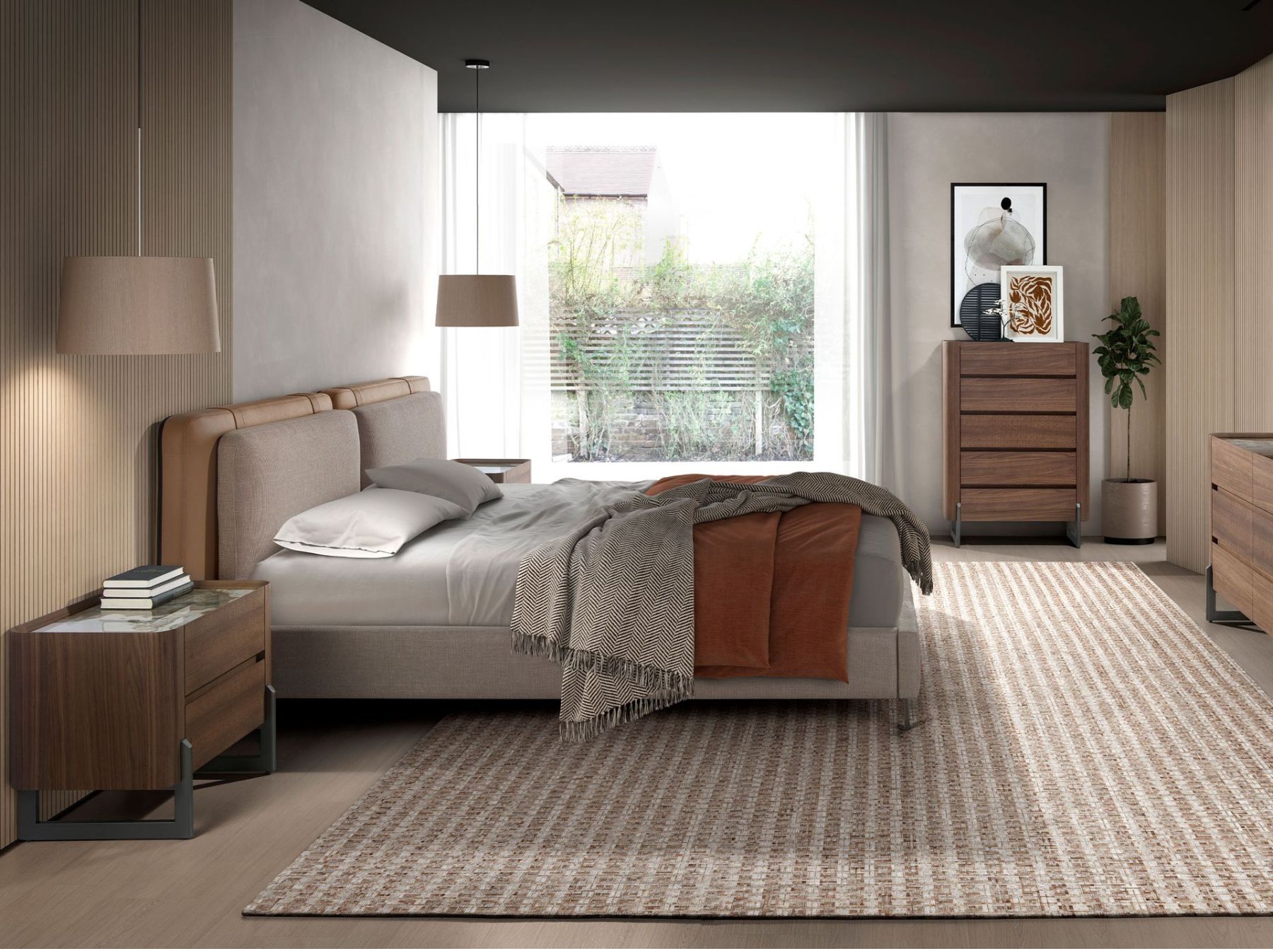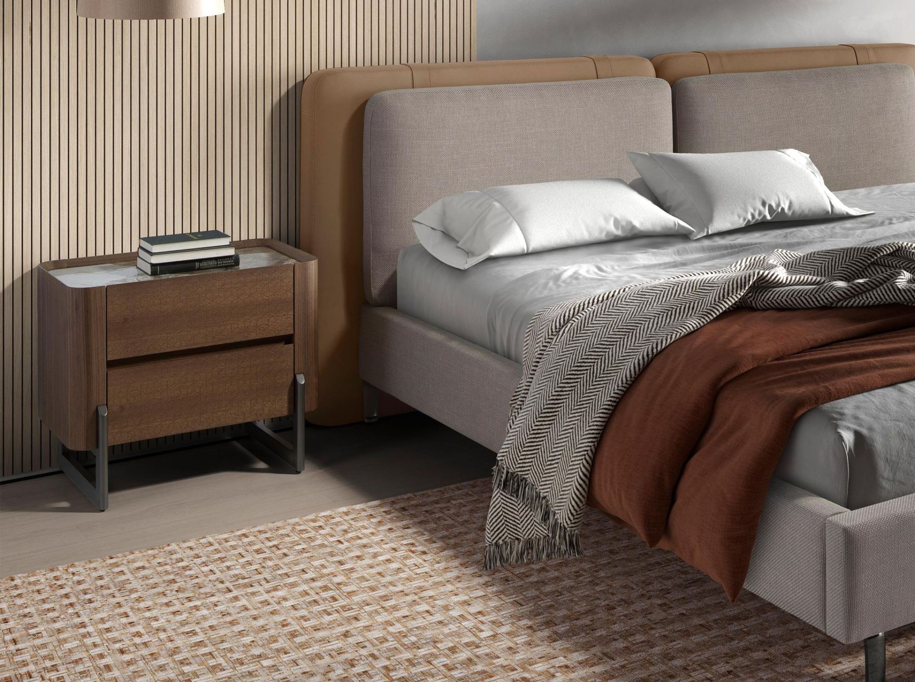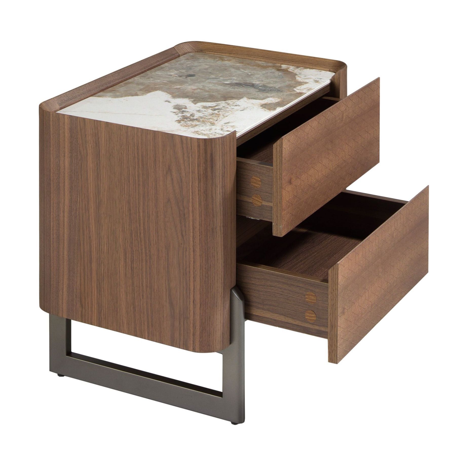 Прикроватная тумбочка современного дизайна с деревянной структурой из натурального шпона ореха и оригинальными ножками из темной металлизированной нержавеющей стали. Благодаря элегантной столешнице из белого фарфорового мрамора с серыми и коричневыми прожилками с глянцевой отделкой вы получите изысканный вид, который вы ищете в своих комнатах. Он имеет большое пространство для хранения с 2 ящиками с системой плавного закрывания.
