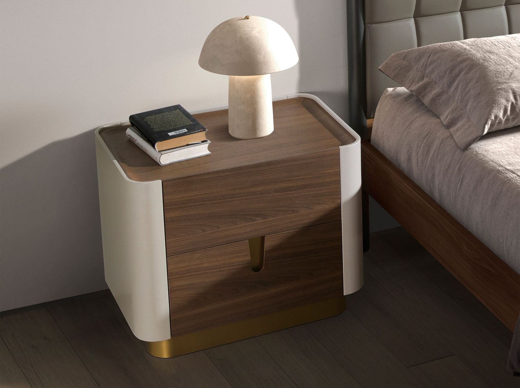 Современный дизайн тумбочки с каркасом из натурального орехового шпона и бежевого лакированного МДФ , с оригинальным основанием из полированной нержавеющей стали золотого цвета . Благодаря элегантной столешнице из натурального орехового шпона , она придаст изысканный вид, который вы ищете в своих комнатах. Ее оригинальная полированная нержавеющая сталь золотого цвета добавит идеальный штрих стиля для вашей гостиной. Она имеет достаточно места для хранения с 2 ящиками /с ручной системой открывания и плавным закрыванием .