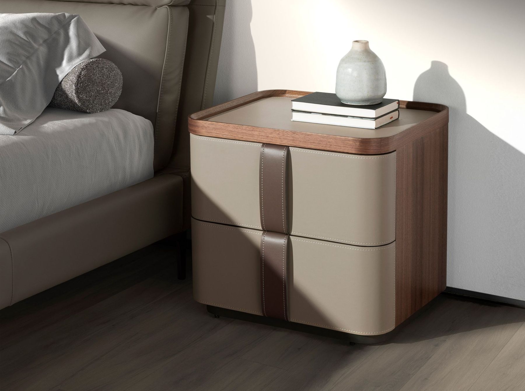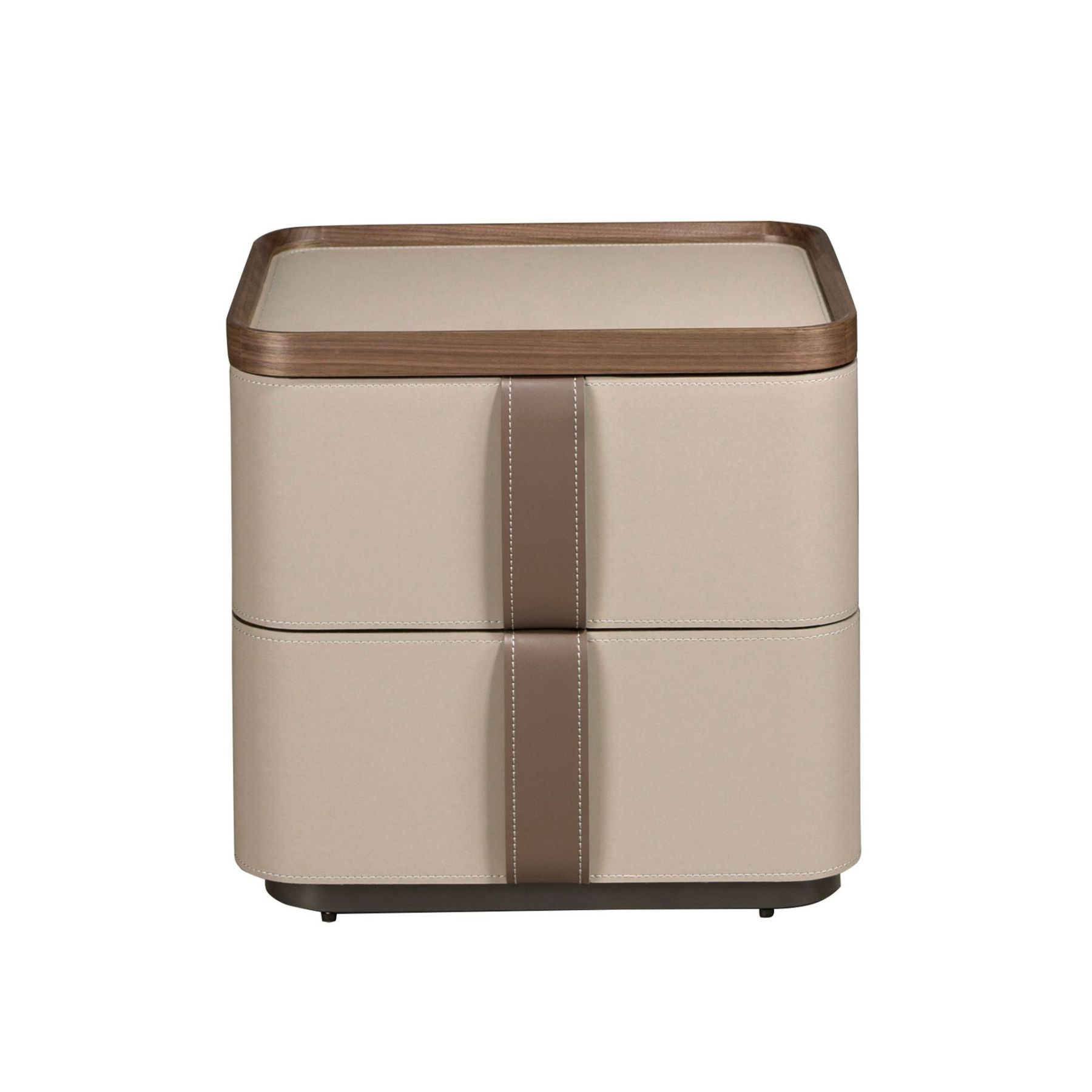 Современный дизайн прикроватной тумбочки с натуральной структурой из орехового шпона, обитой кожей цвета норки и оригинальной полированной нержавеющей стальной основой. Имеет большое пространство для хранения с 2 ящиками с системой открывания с помощью язычка и системой плавного закрывания.