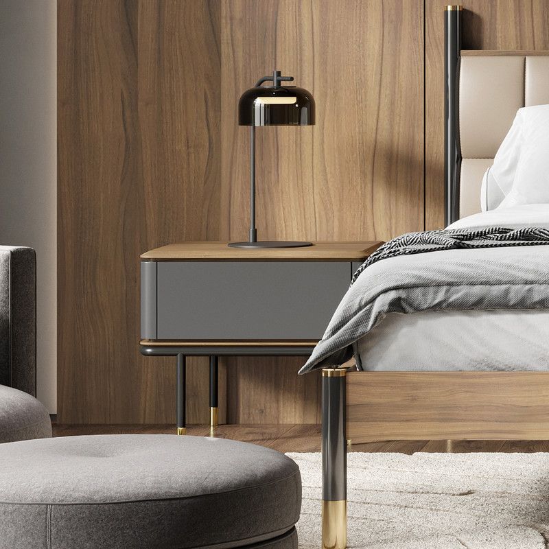 Модель прикроватной тумбочки имеет деревянную столешницу из натурального шпона ореха со скругленными углами, что предотвращает травмирование.