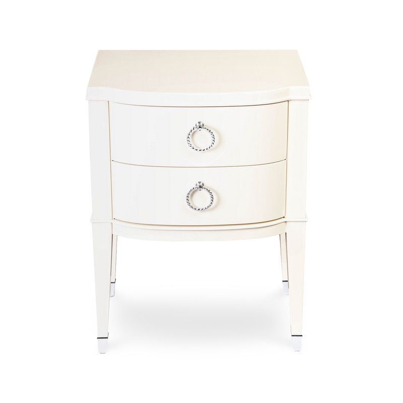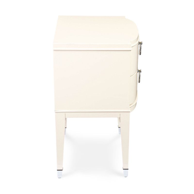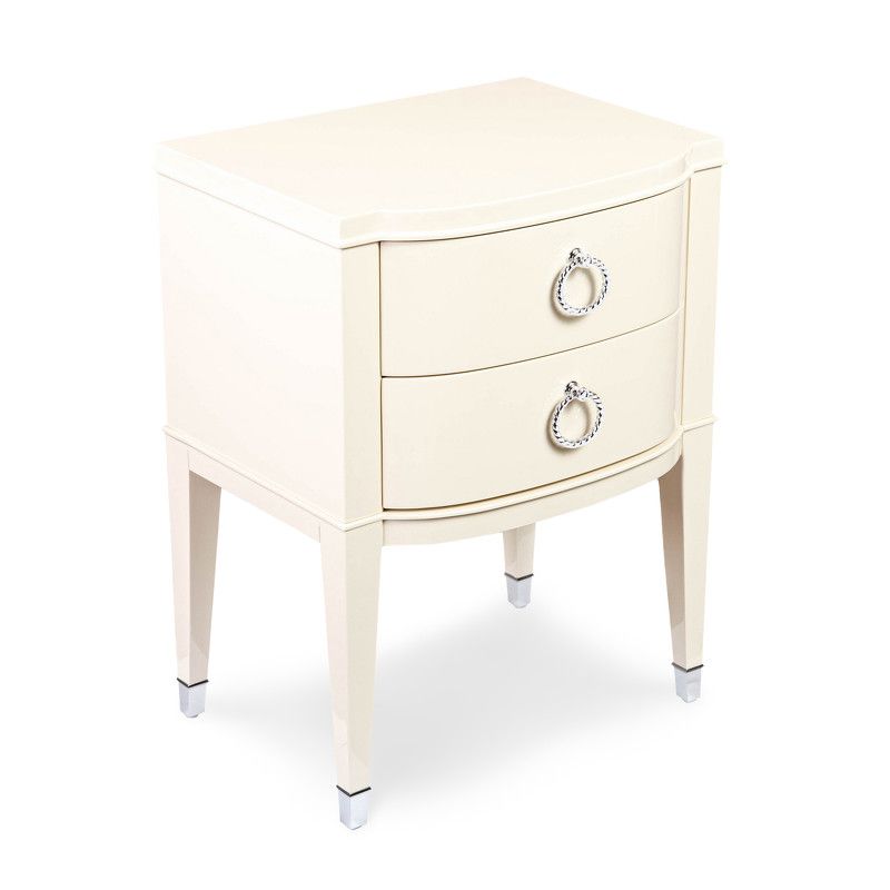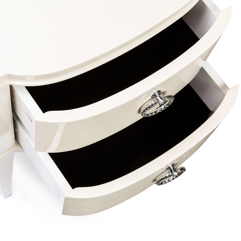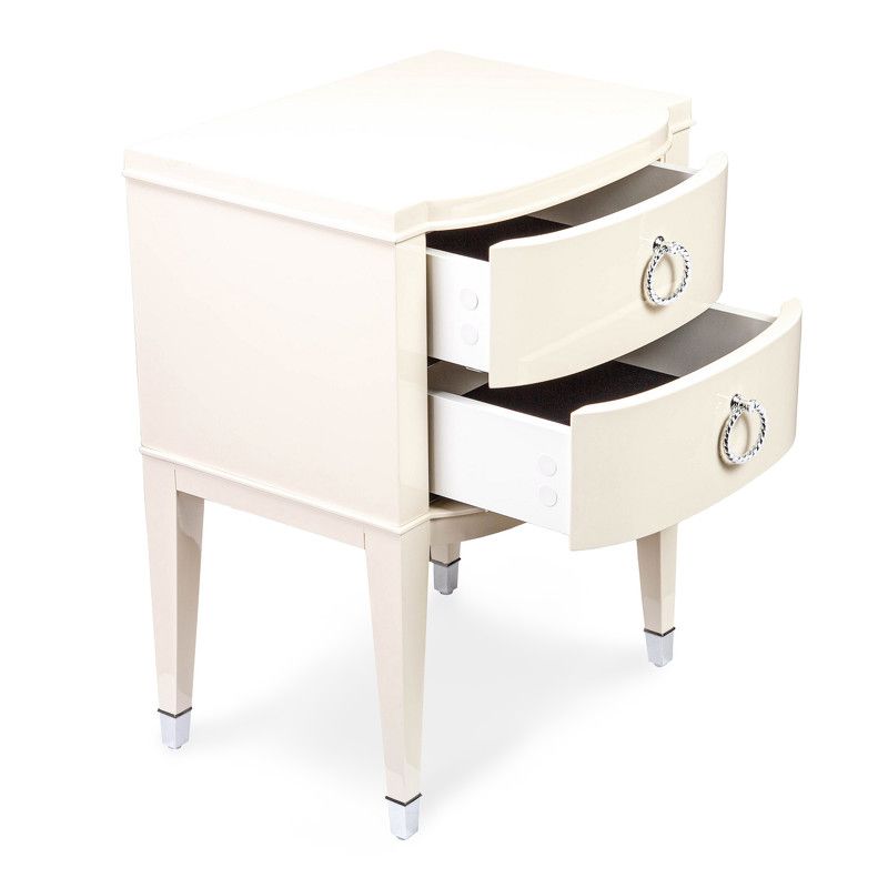 Изящная прикроватная тумбочка Modena от итальянского бренда Fratelli Barri. Тумбочка в неоклассическом стиле, с двумя выдвижными ящиками. Закругленные фасады. Отделка - бежевый блестящий лак. На ножках металлические колпачки.