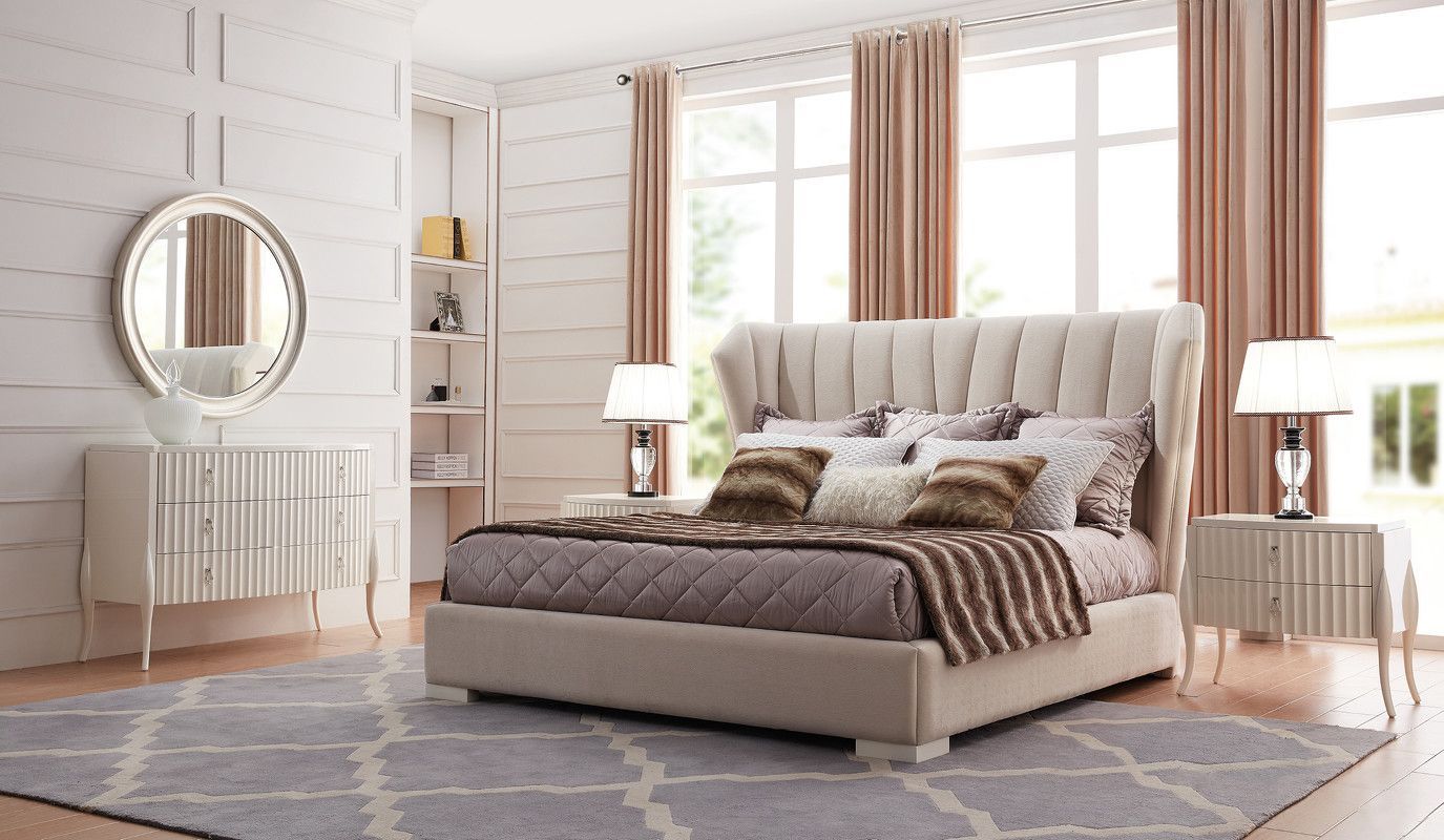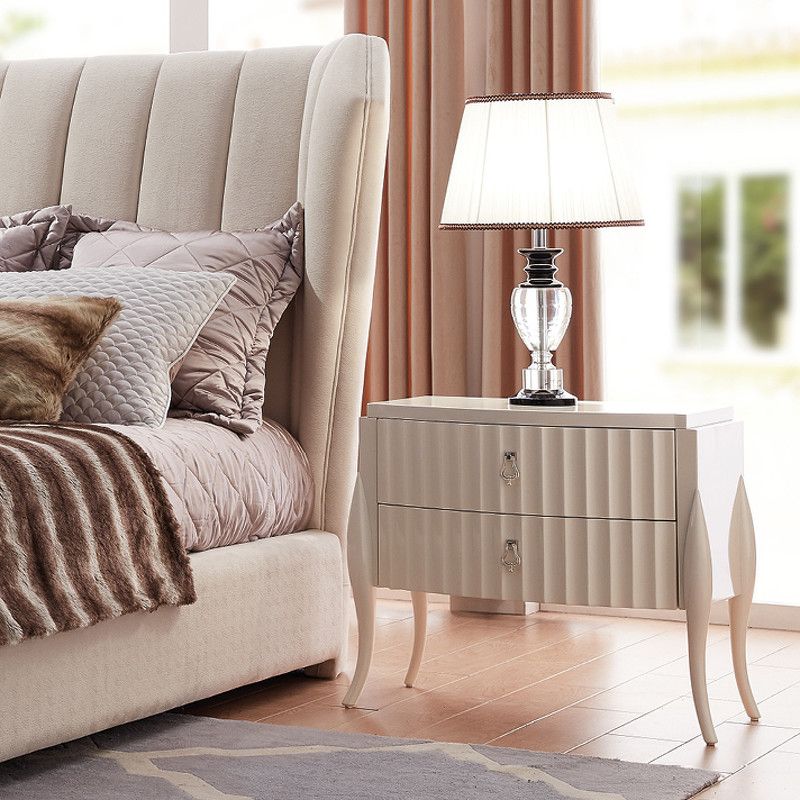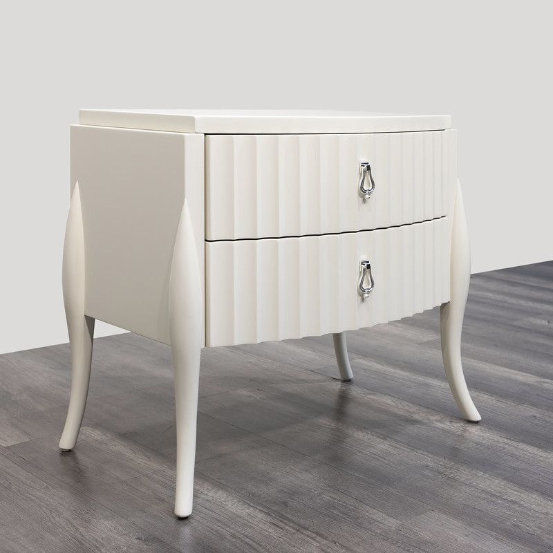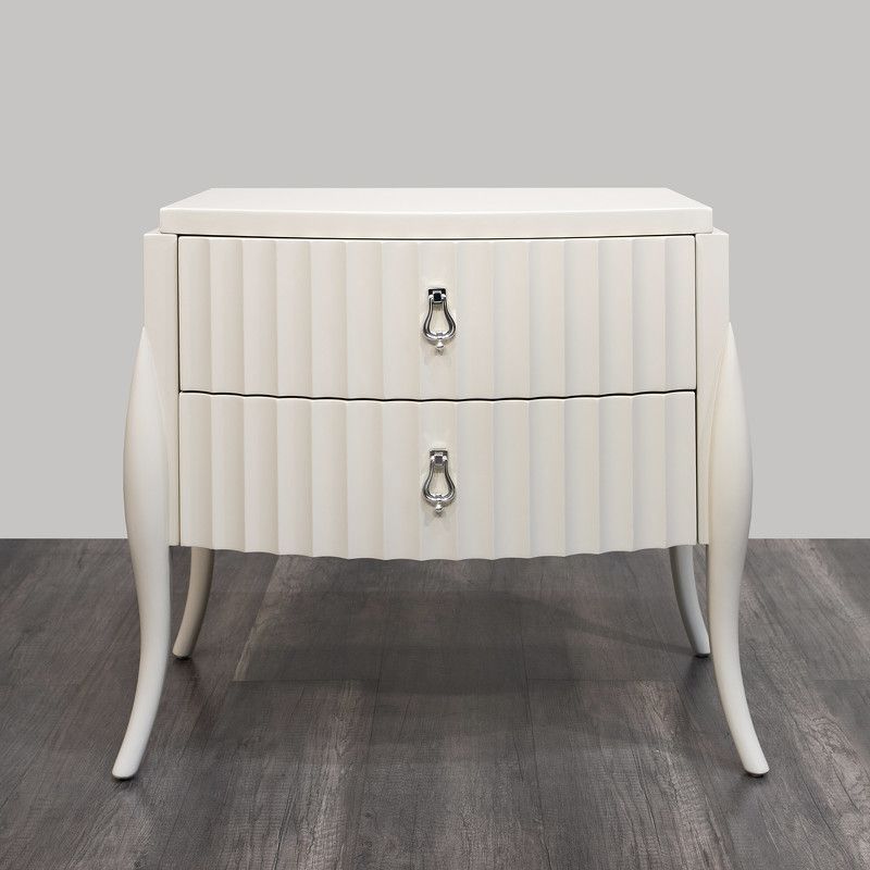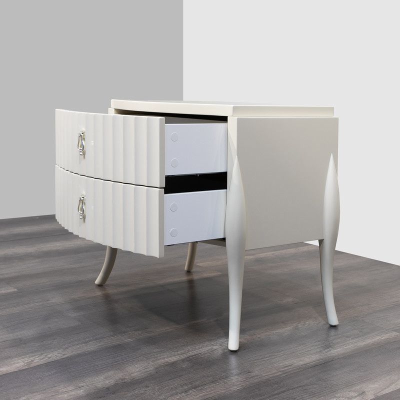 Элегантная прикроватная тумбочка от итальянского бренда Fratelli Barri имеет два вместительных ящика и стоит на высоких изогнутых ножках. Тумбочка в неоклассическом стиле. Рифленые фасады. Отделка - бежевый матовый лак.