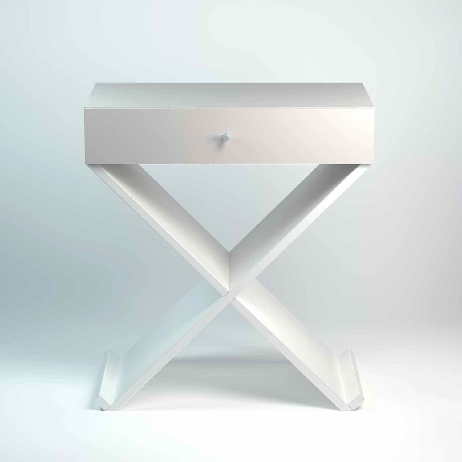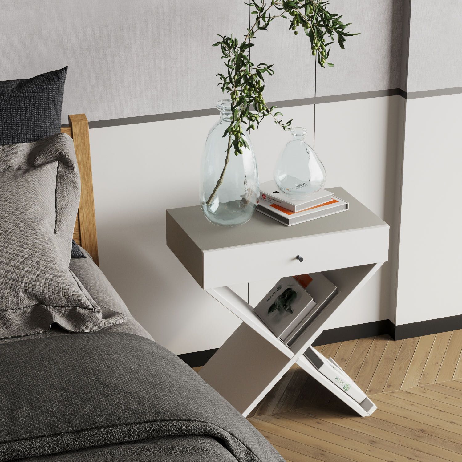 Тумба Bonn в стиле минимализм.Тумба может служить не только прикроватной тумбой, но так же и кофейным или журнальным столиком. И хотя у неё есть только один выдвижной ящик, но изготовленные крест накрест ножки могут также служить нишами для газет, журналов или даже ноутбука. Корпус -серый ral 7038, основание-белый ral 9003