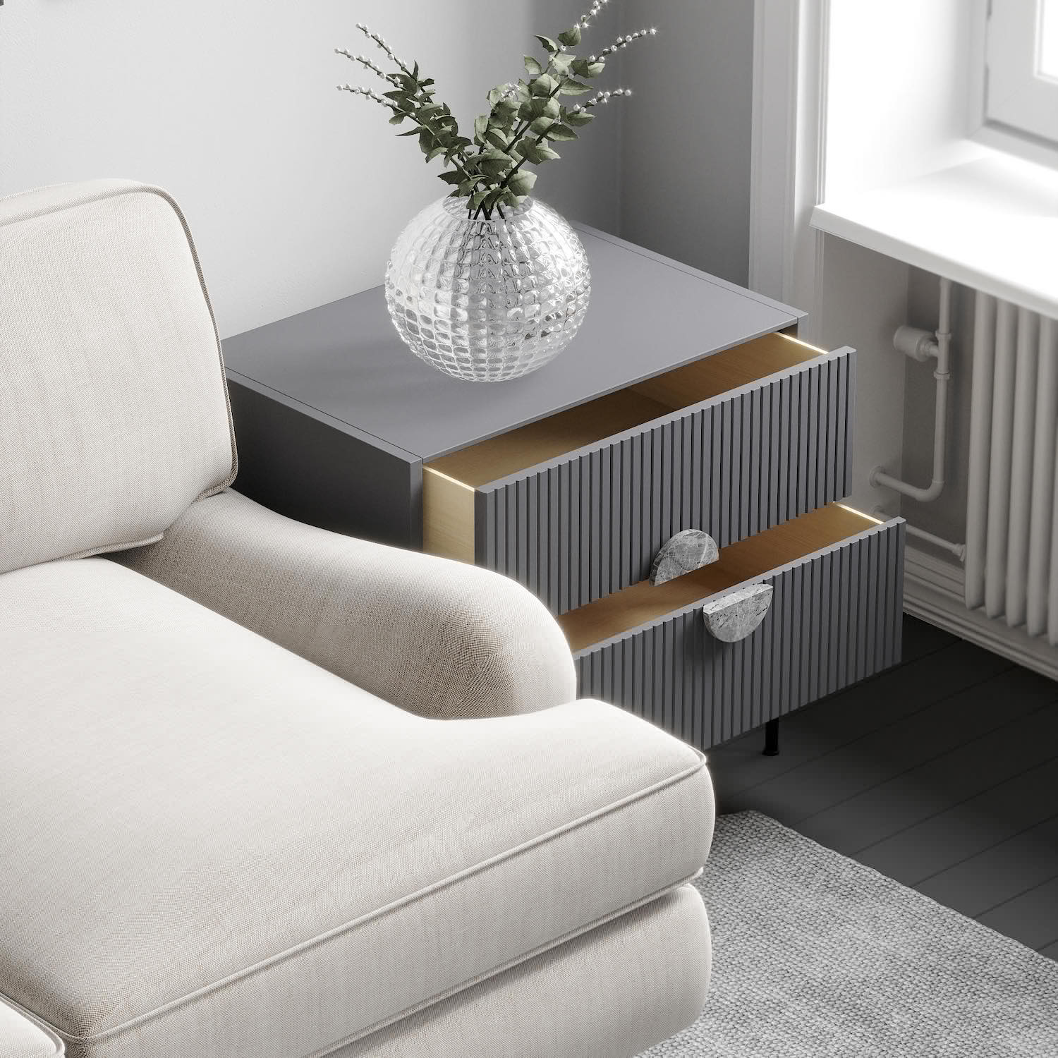 Выдвижные ящики оснащены доводчиками Корпус эмаль ral 7015, ножки- черная эмаль, ral 9011