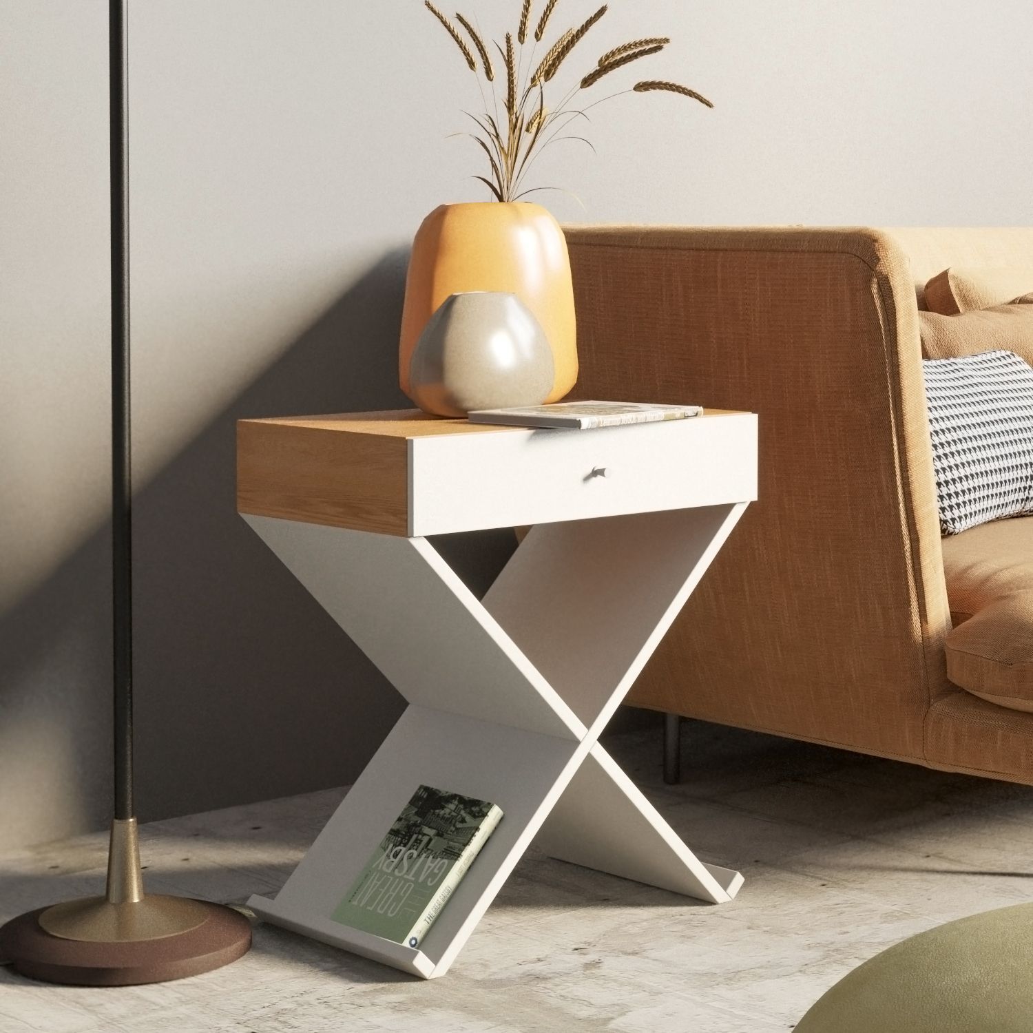 Тумба Bonn в стиле минимализм.Тумба может служить не только прикроватной тумбой, но так же и кофейным или журнальным столиком. И хотя у неё есть только один выдвижной ящик, но изготовленные крест накрест ножки могут также служить нишами для газет, журналов или даже ноутбука. Фасад ящика и основание-белый ral 9003, корпус-лак