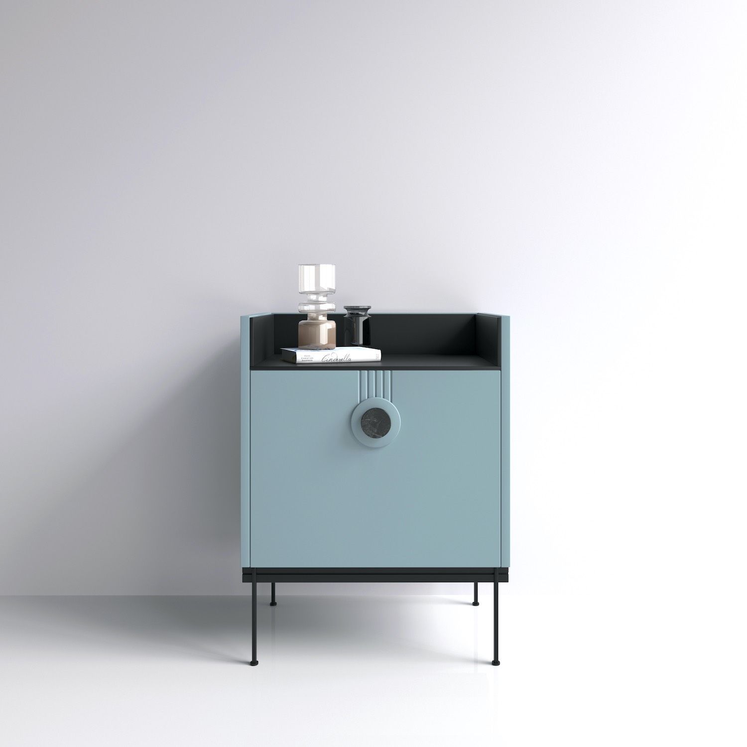 Распашная дверца тумбы оснащена петлями с доводчиками плавного закрывания, по центру одна полка. Корпус-эмаль ral design 220-70-10, ниша, основание и ножки-эмаль ral 9011