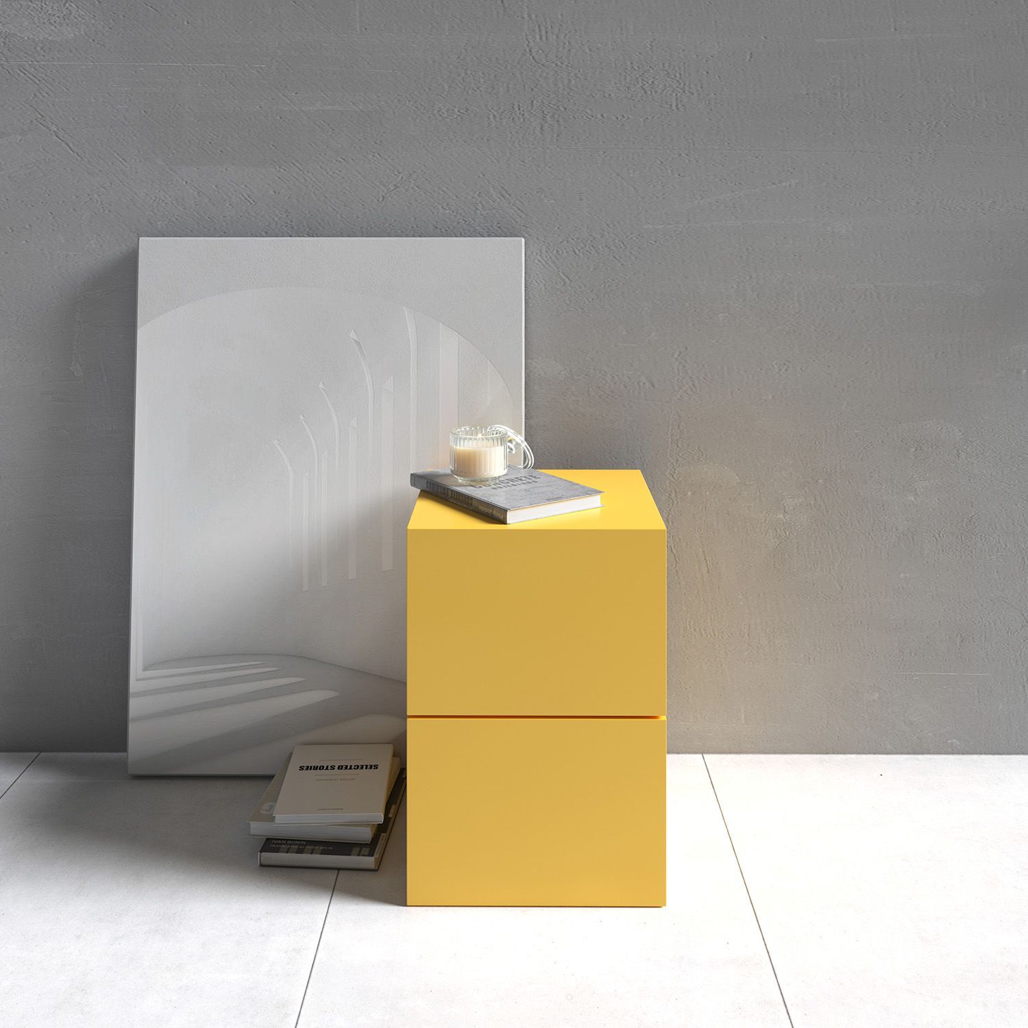 Яркий цвет,но при этом строгая форма ,сделают выразительным Ваш интерьер и подчеркнут современный и безупречный стиль.Можно использовать любой из сторон. Два вместительных ящика, оснащены направляющими плавного хода, полного выдвижения с открытием нажатием (PUSH). Материалы: мдф, эмаль. Эмаль желтая ral 1018