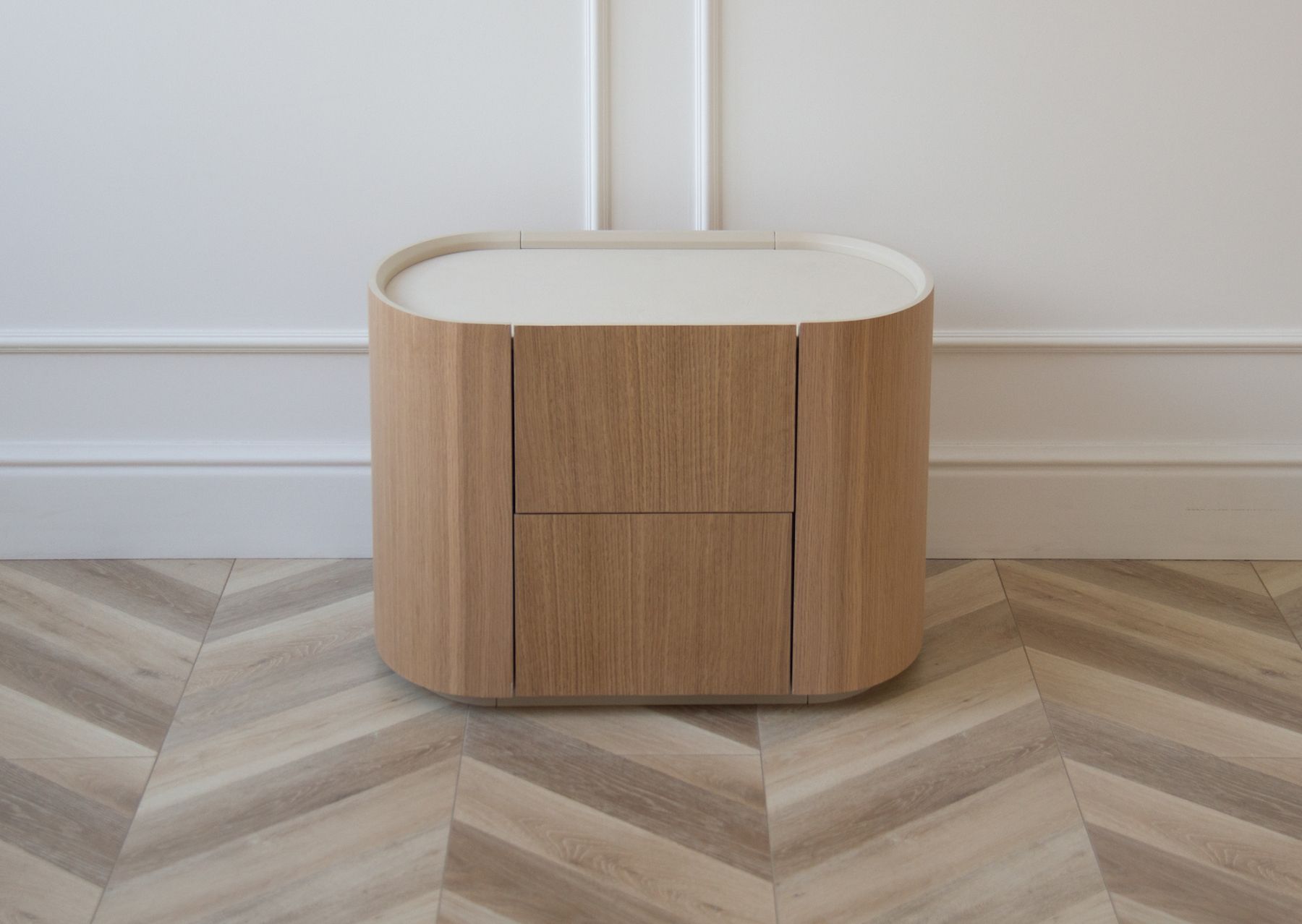Корпус: МДФ (фасады, задняя стенка, столешница), шпон березы (бока), ЛДСП (внутри)