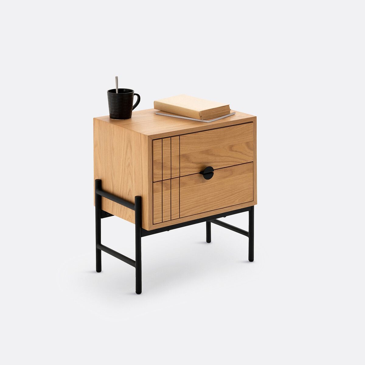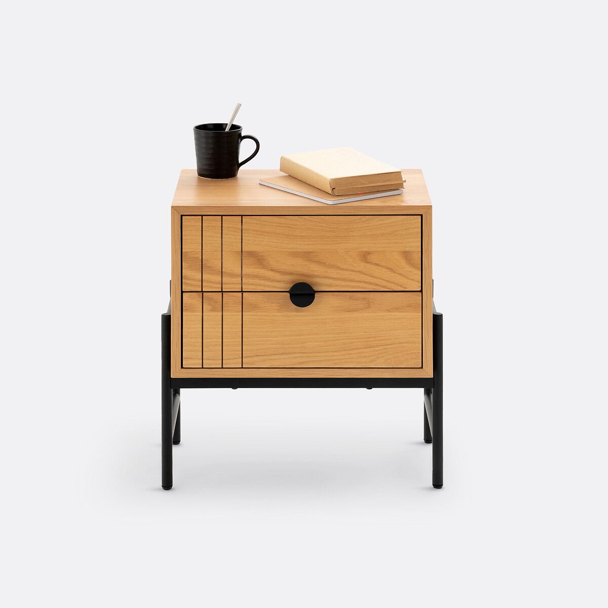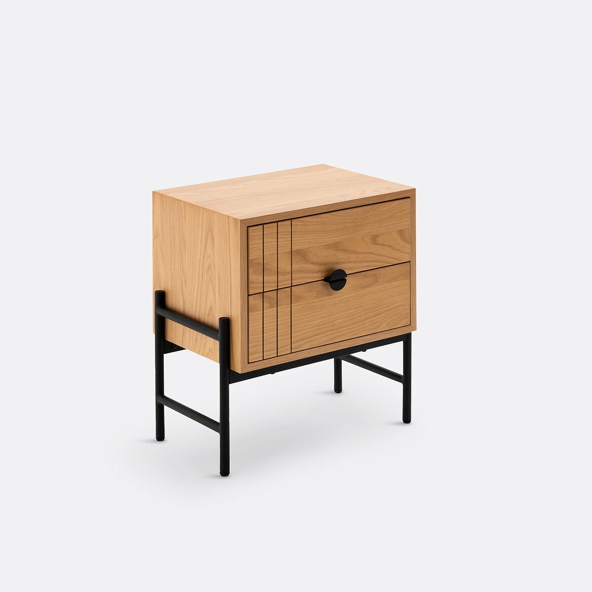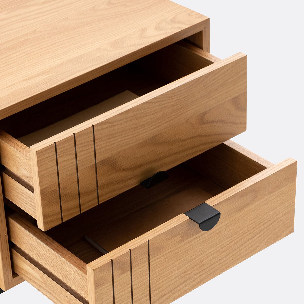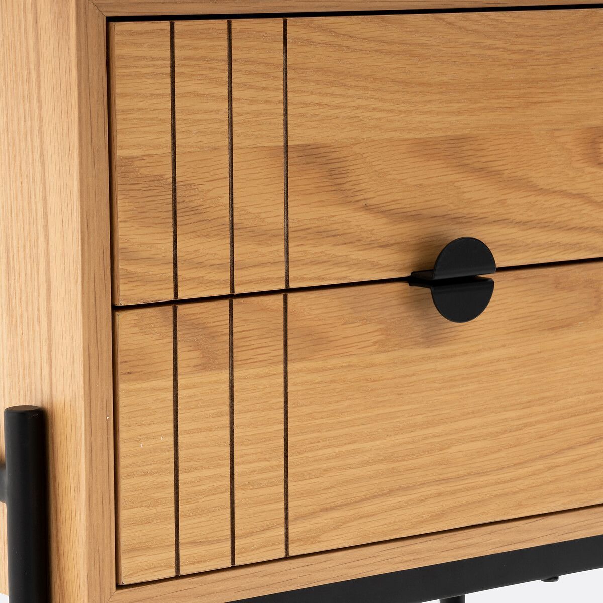 — Каркас из МДФ, покрытого дубовым шпоном, с покрытием нитролаком с декоративными полосами на фасадах ящиков