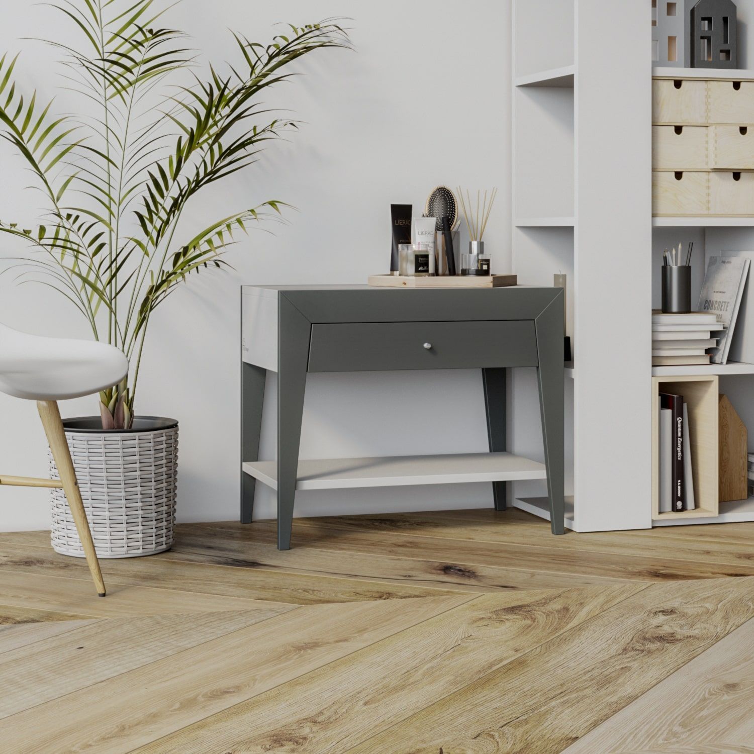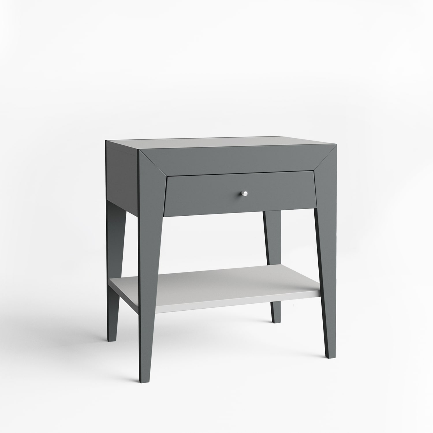 Тумба отличается необычным дизайном и функциональностью. Тумба оснащена одним выдвижным ящиком и одной полочкой Корпус-эмаль светло-серая ral 7047,фасад ящика и ножки-эмаль серая ral 7012