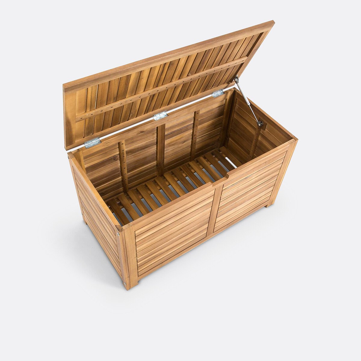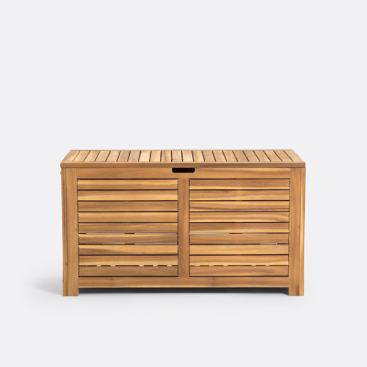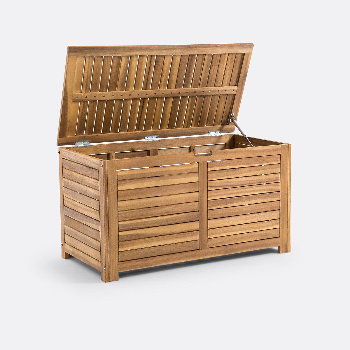 Ящик для вещей из акации. Из прочного дерева, можно расположить на открытом воздухе, в гараже, в него можно положить: подушки, садовый инструмент, игры для пленэра...Характеристики : • Из акации под тик • Масляное покрытие • Ящик для вещей из акации готовый к сборке согласно инструкции.Размеры: • Общие размеры: Д90 x В50 x Г45 см