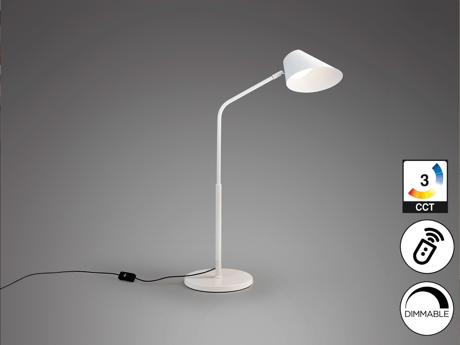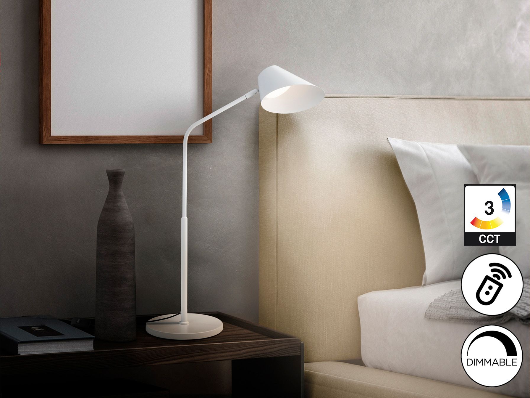 Настольная лампа из металла и алюминия, матово-белая отделка, опаловый рассеиватель. Тактильная кнопка и ПУЛЬТ ДИСТАНЦИОННОГО УПРАВЛЕНИЯ. Регулируемый прожектор, регулировка яркости света, регулируемая цветовая температура. Светодиод 12 Вт, 1300 лм, CCT 3000K-6500K
