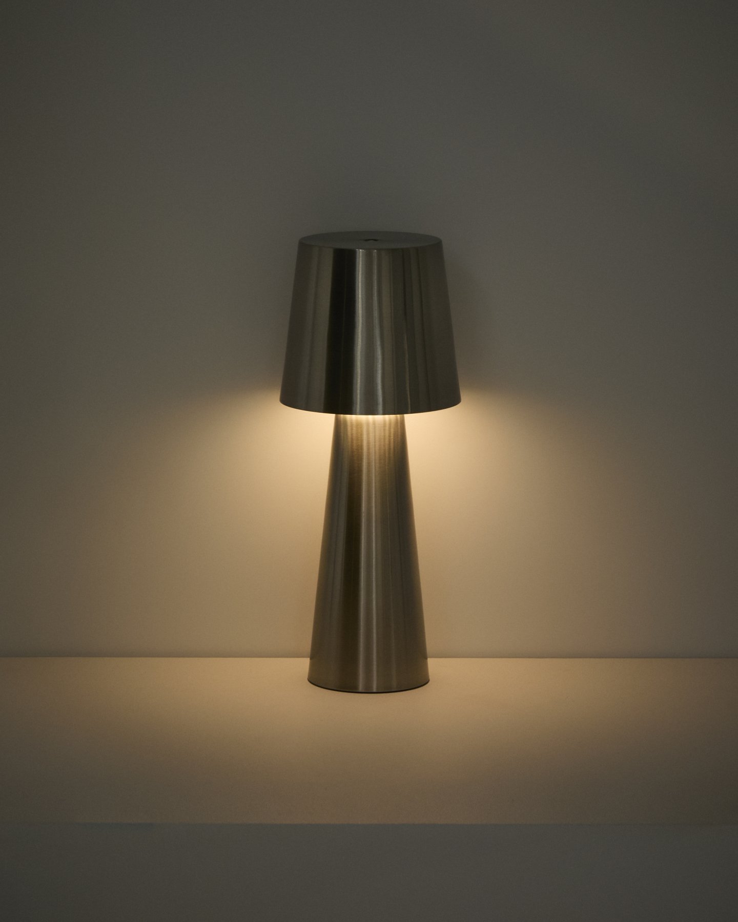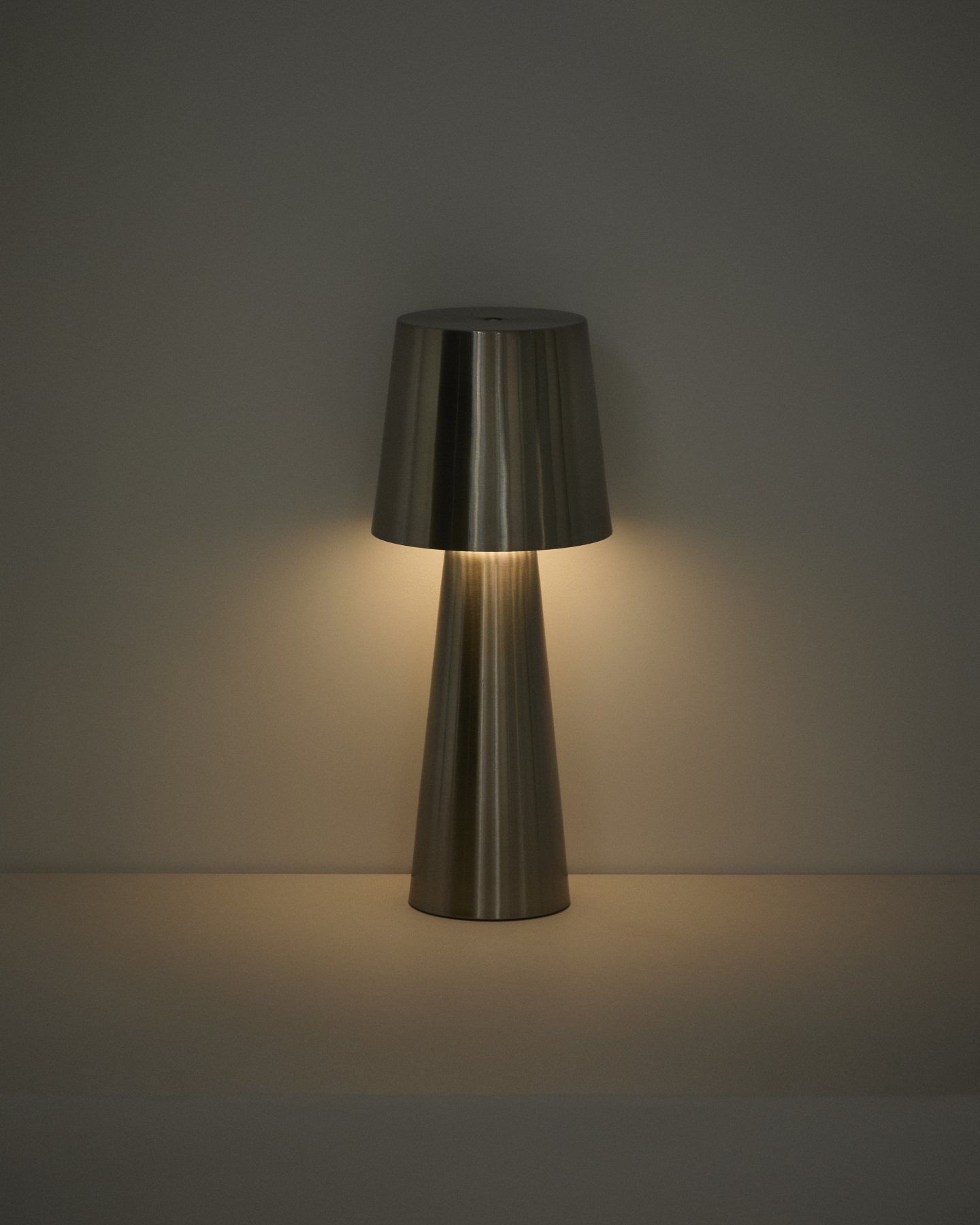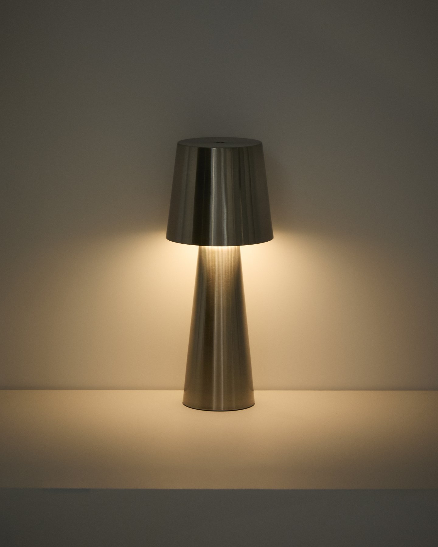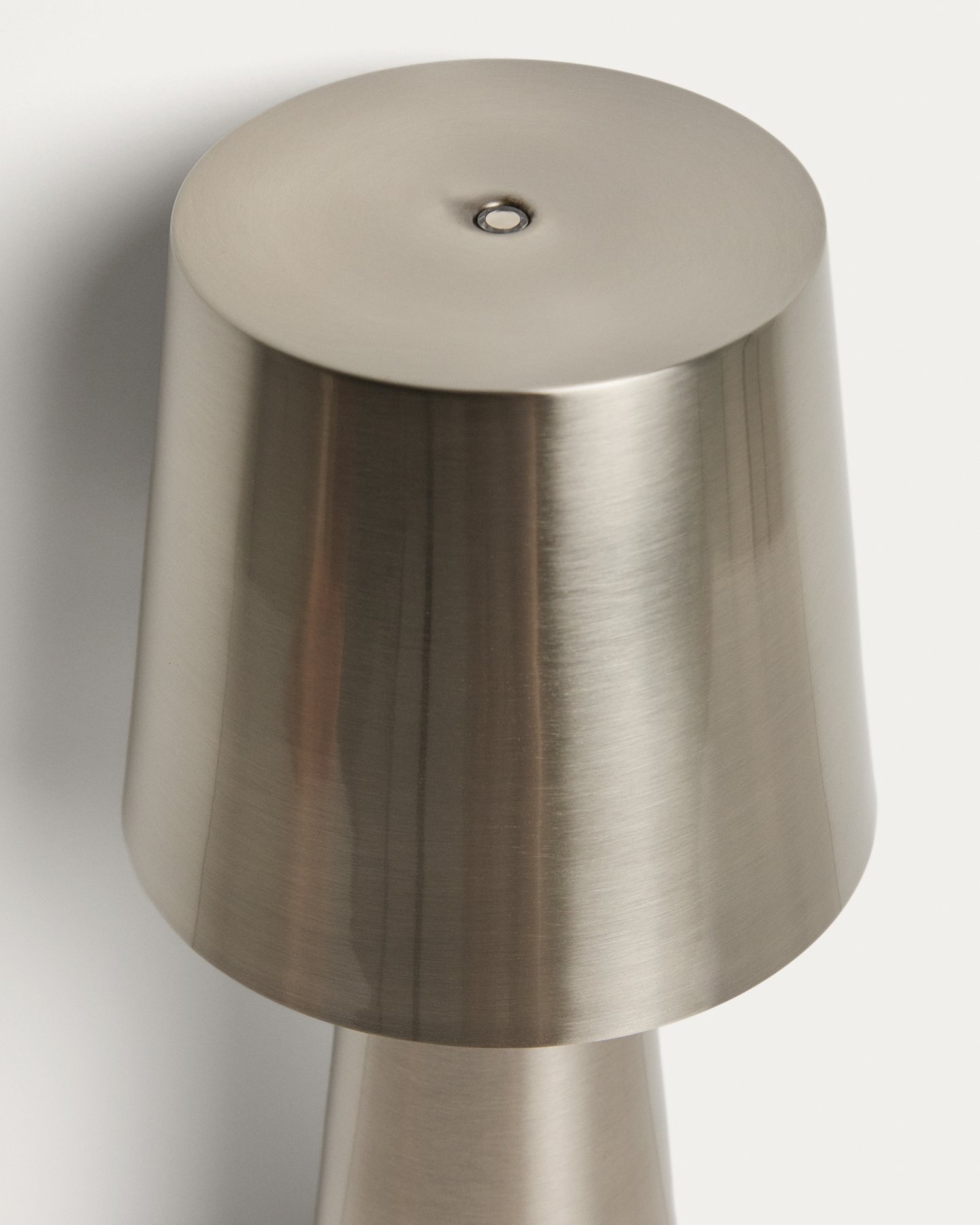 Настольная лампа Arenys сочетает в себе инновации и простоту в компактном и универсальном изделии, созданном для того, чтобы сопровождать разные моменты дня функциональным и эстетичным освещением. Она изготовлена из металла с блестящей отделкой, которая подчеркивает ее скульптурную форму и мягко отражает свет. Благодаря обработке, предотвращающей появление отпечатков пальцев, поверхность остается чистой и яркой, сохраняя свой безупречный вид на протяжении долгого времени. Перезаряжаемая конструкция со встроенным аккумулятором позволяет легко перемещать и использовать лампу.
