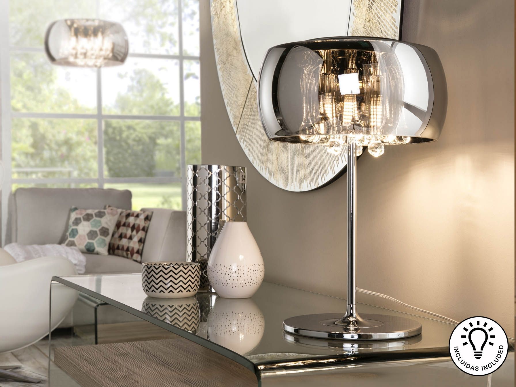 Настольная лампа из металла с покрытием "хром", плафон из зеркального стекла с подвесками внутри из стекла подобного муранскому,
