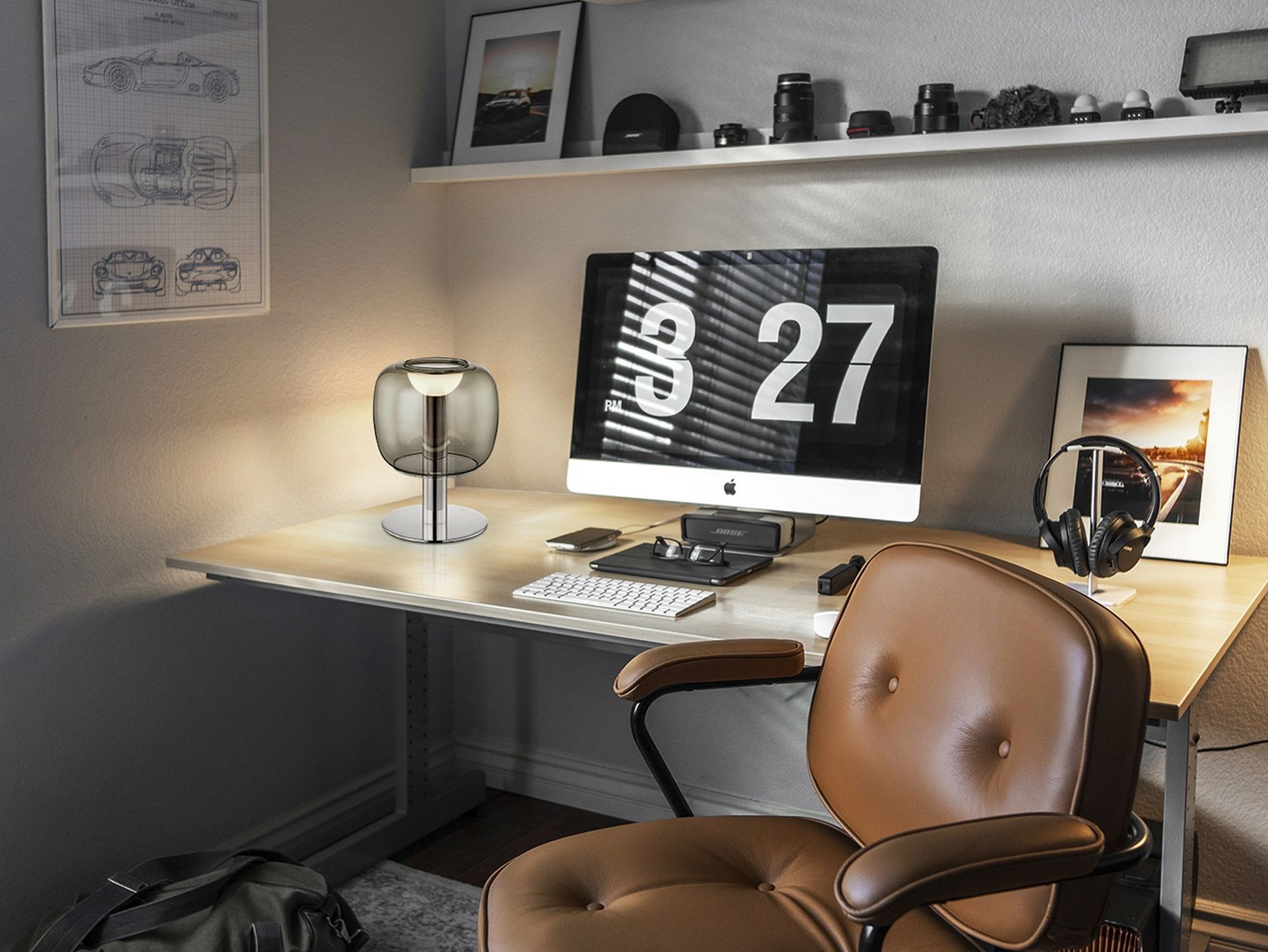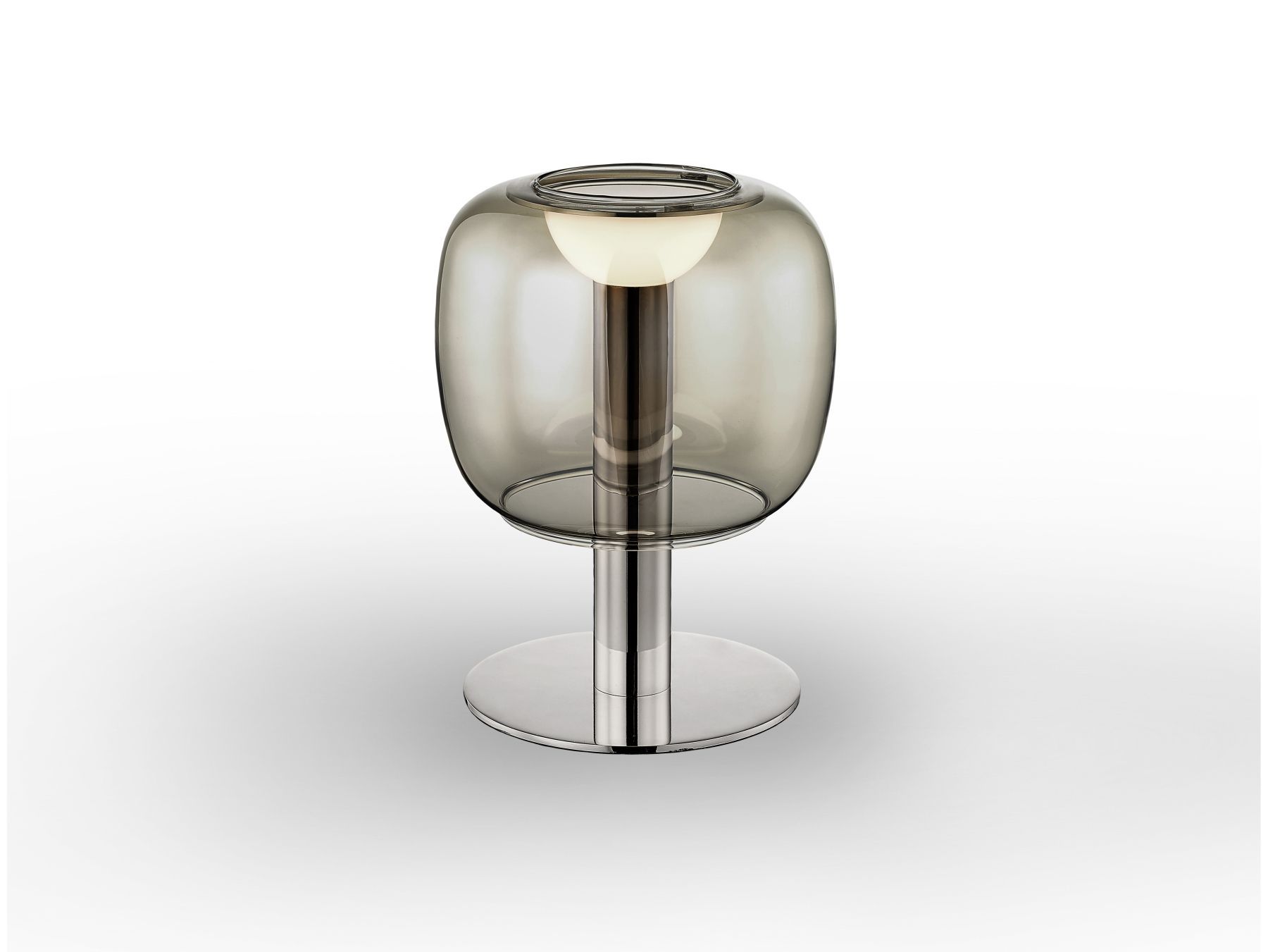 Настольная лампа из металла, хромированная отделка. Абажур из дымчатого стекла. Светодиодное освещение 5 Вт, 500 лм, 3000 К.