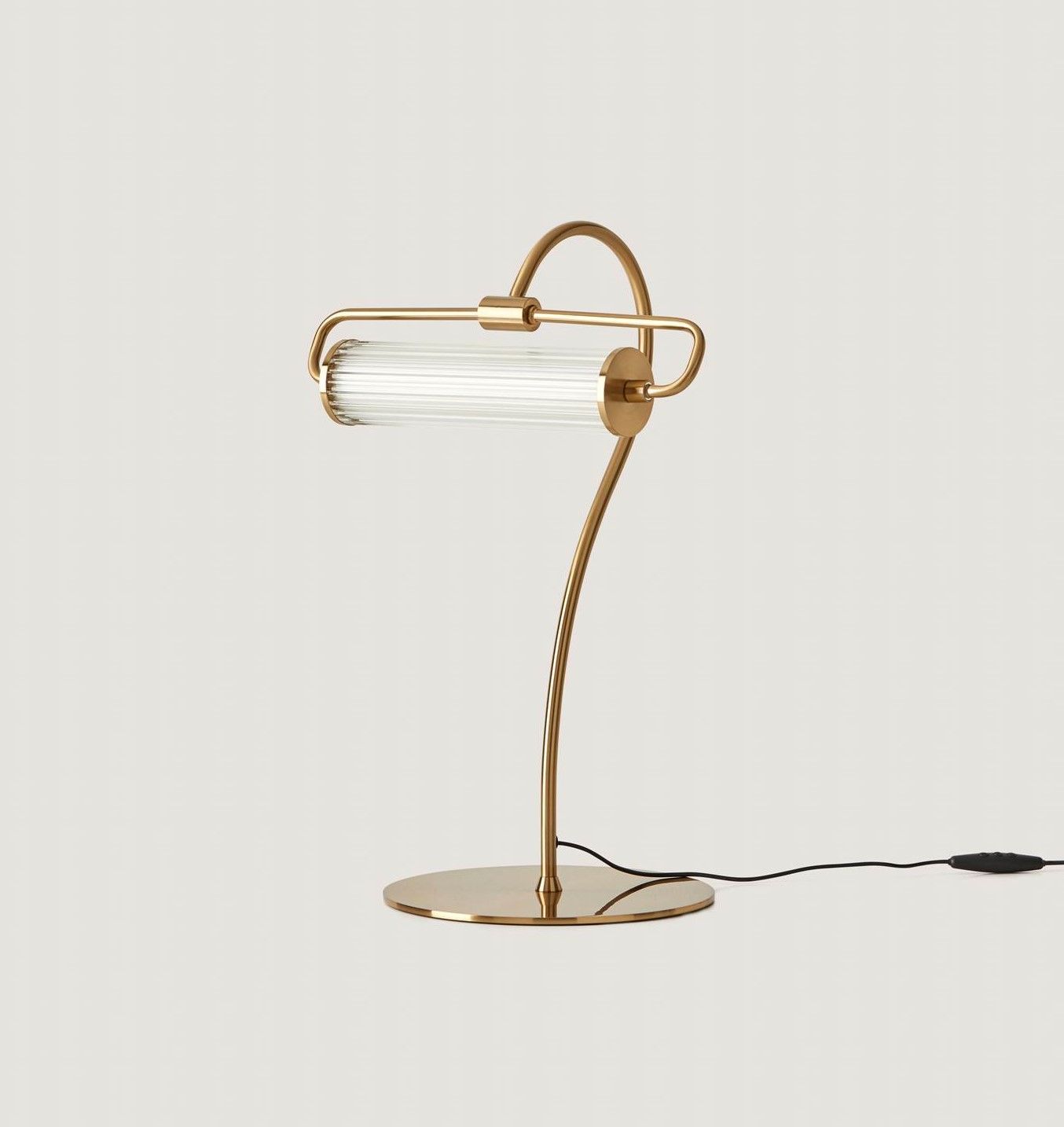 Настольная лампа, выполненная из металла и стекла в матовой черной или латунной отделке.