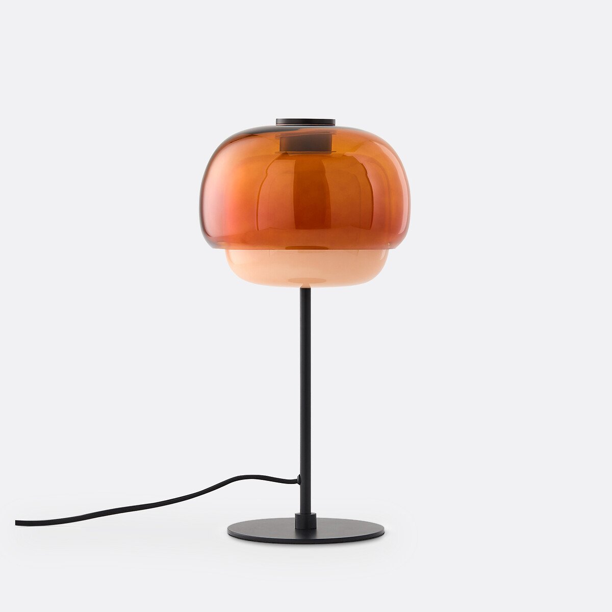 Конструкция абажура выполнена из двух связанных между собой элементов. У основания располагается стеклянная сфера с плотным покрытием, над ней же «нависает» прозрачная грибовидная сфера в более насыщенном оттенке. Оба элемента выдуваются вручную, а значит — вы получаете не только стильный, но и уникальный предмет декора. Тонкая ножка из железа эффектно контрастирует с объёмным абажуром, смотрится просто и деликатно.