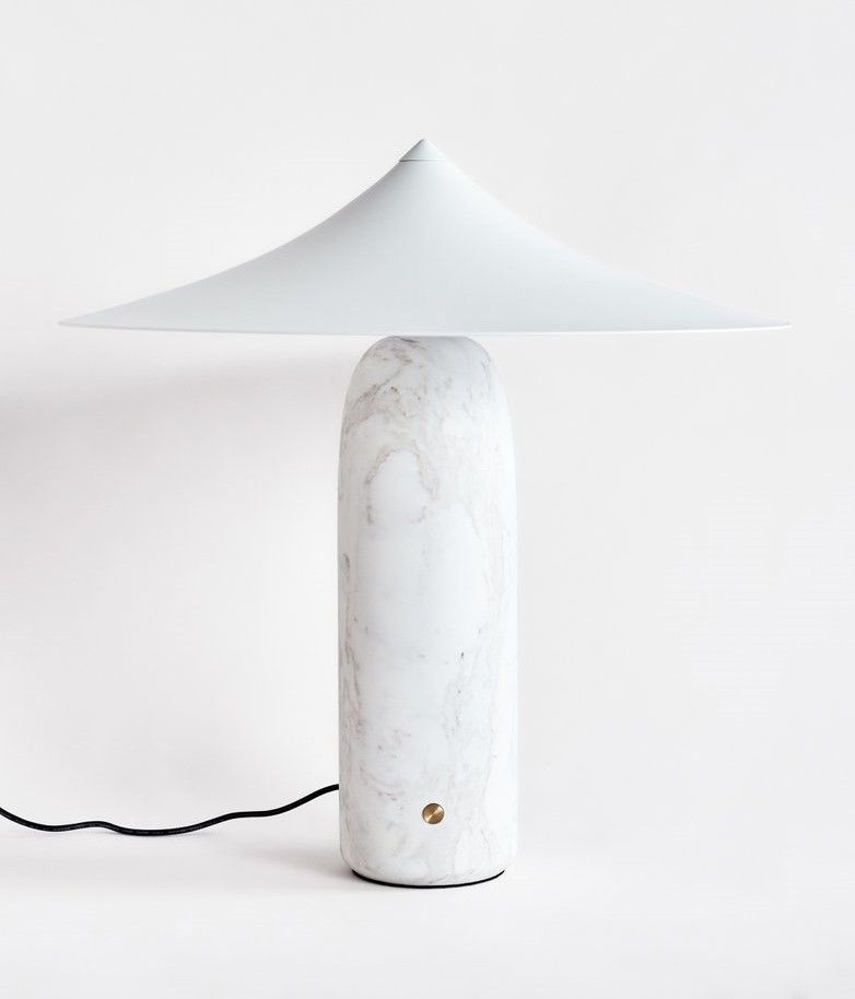 Настольная лампа состоит из мраморного основания и металлического абажура. В зависимости от выбранной модели, абажур может быть латунным, черным или белым. Покрытие порошковое, матовое.
