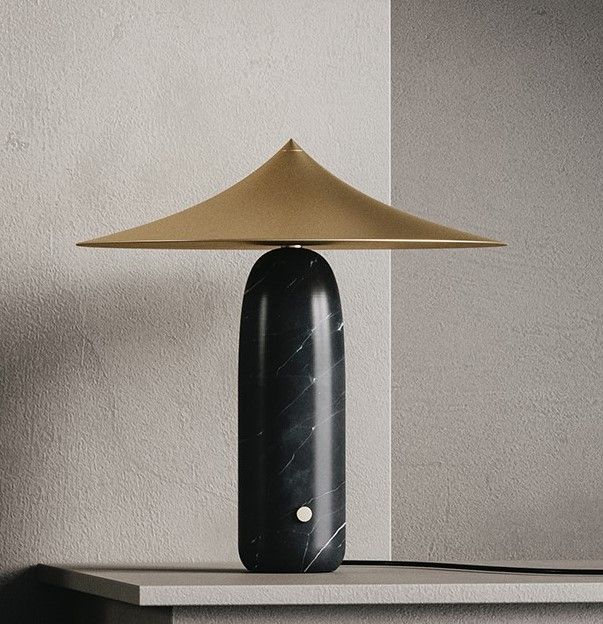 Настольная лампа состоит из мраморного основания и металлического абажура. В зависимости от выбранной модели, абажур может быть латунным, черным или белым. Покрытие порошковое, матовое.