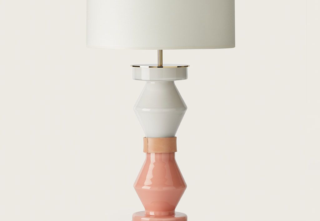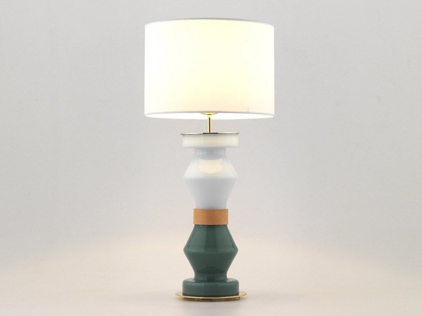 Дизайнерское основание настольной лампы со стальной конструкцией в золотом, хромированном, черном или белом исполнении с двумя элементами из цветного стекла, которые вы можете комбинировать, выбирая из палитры и декоративным элементом из натуральной кожи. Вы можете добавить к нему абажур.