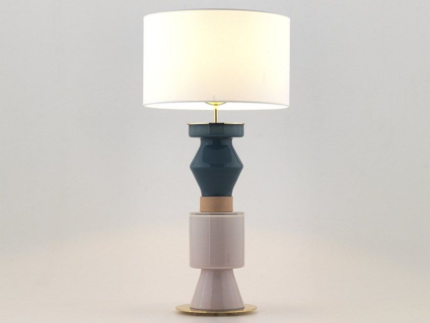 Дизайнерское основание настольной лампы со стальной конструкцией в золотом, хромированном, черном или белом исполнении с двумя элементами из цветного стекла, которые вы можете комбинировать, выбирая из палитры и декоративным элементом из натуральной кожи. Вы можете добавить к нему абажур.