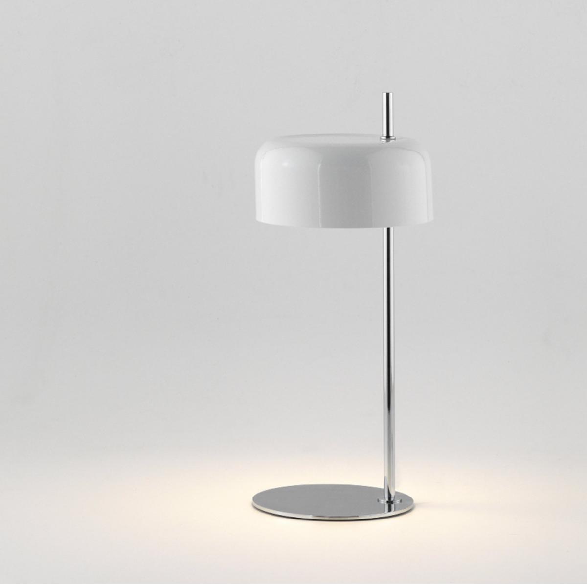 Настольная лампа Lalu сделана из металла и продаётся в хромированной или золотистой отделке. Абажур с рассеивателем предложен в глянцевом белом цвете. Сочетание белоснежного и металлического блеска смотрится весьма эффектно, однако при желании заказчик может согласовать другие оттенки, более точно попадающие в поставленные перед ним задачи.Патрон светильника — Е27. Лампочка не входит в комплект и докупается отдельно.