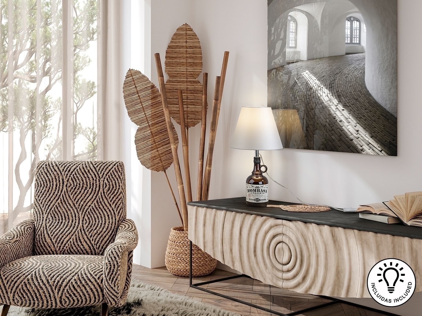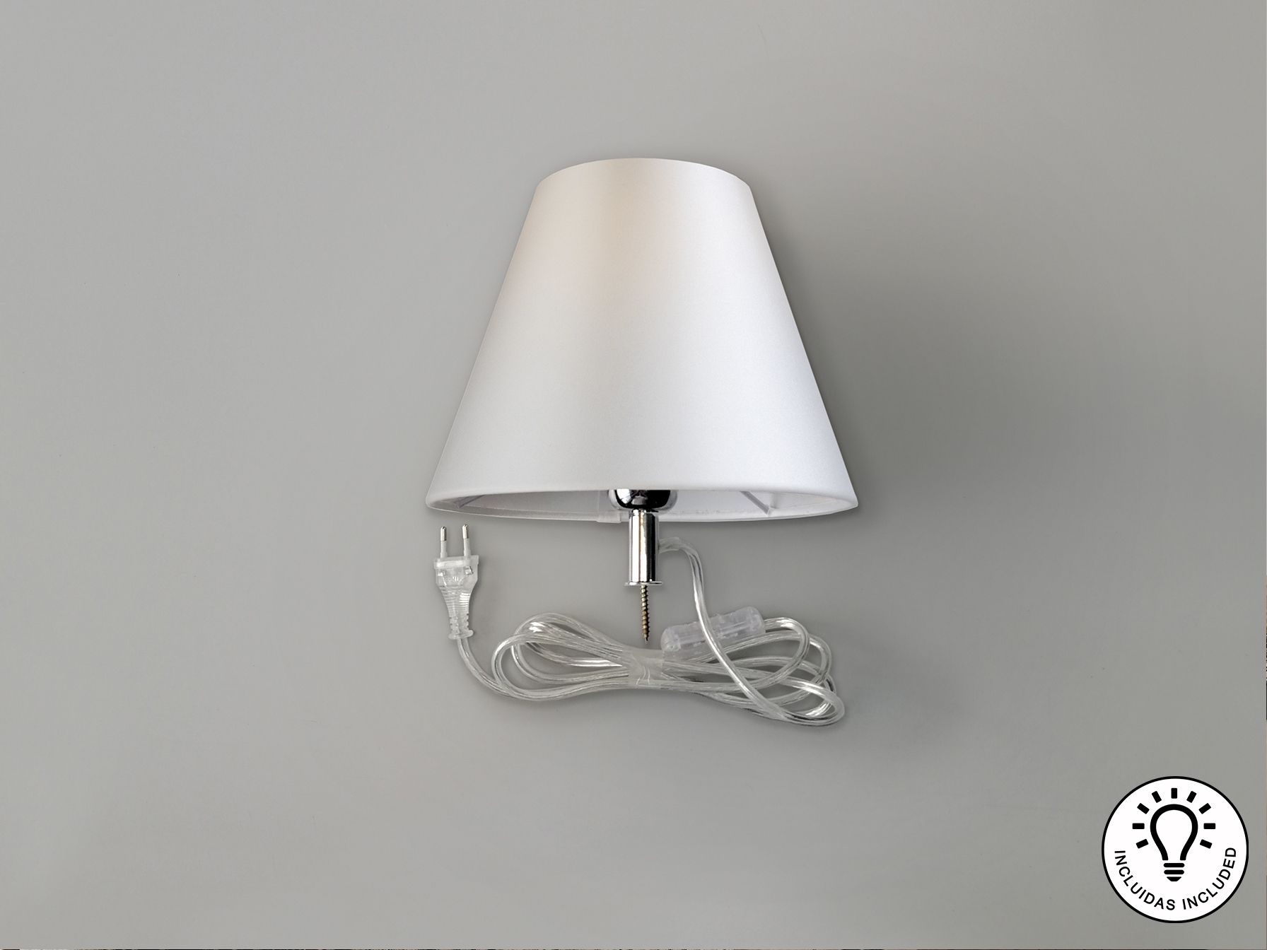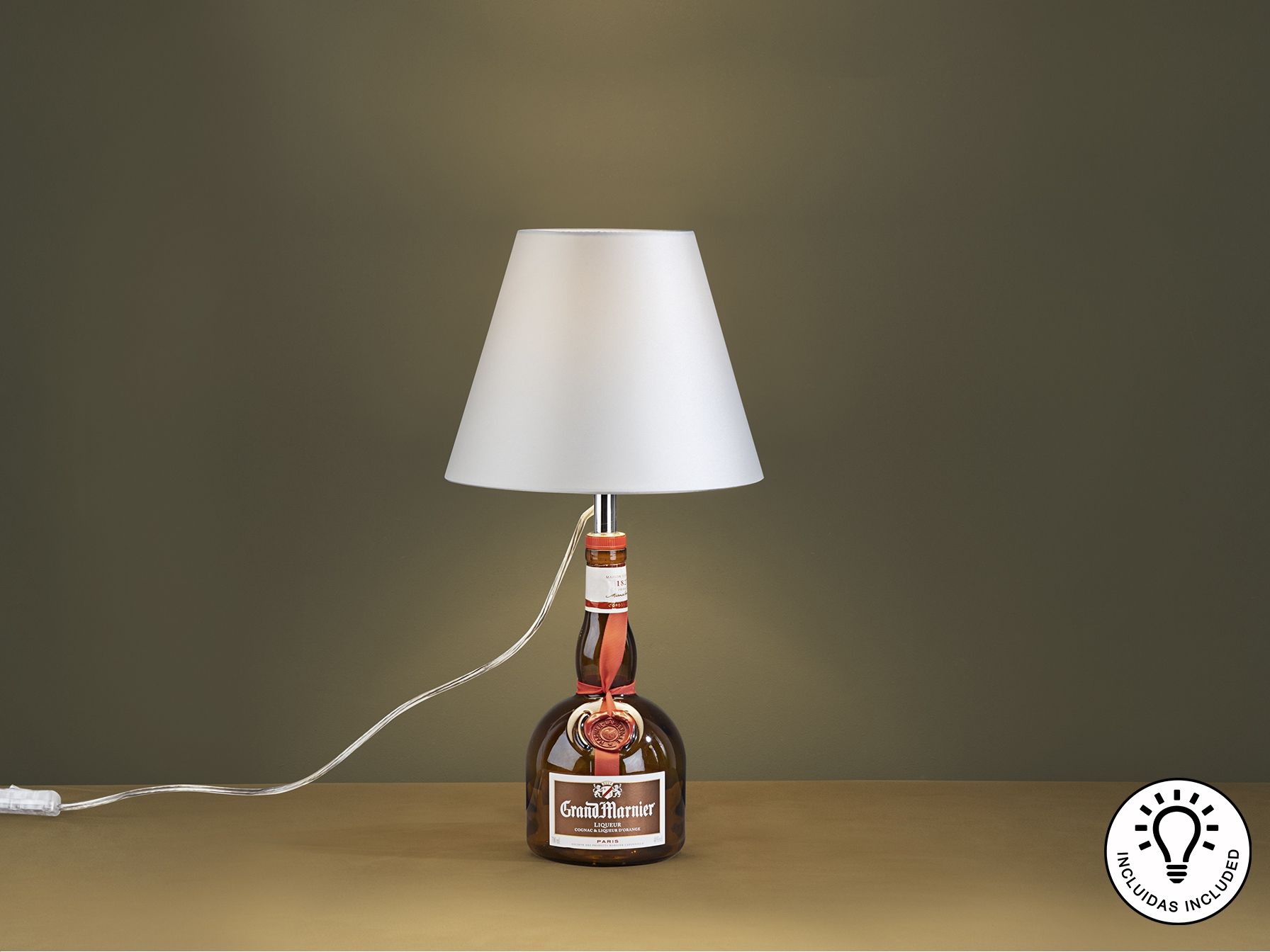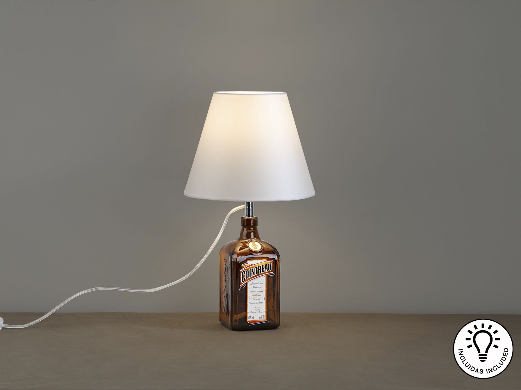 Комплект освещения для превращения винных или ликерных бутылок в настольные лампы. Включает опору освещения с хромированной отделкой, лампочку с регулируемой яркостью и абажур из жемчужно-белой атласной ткани.