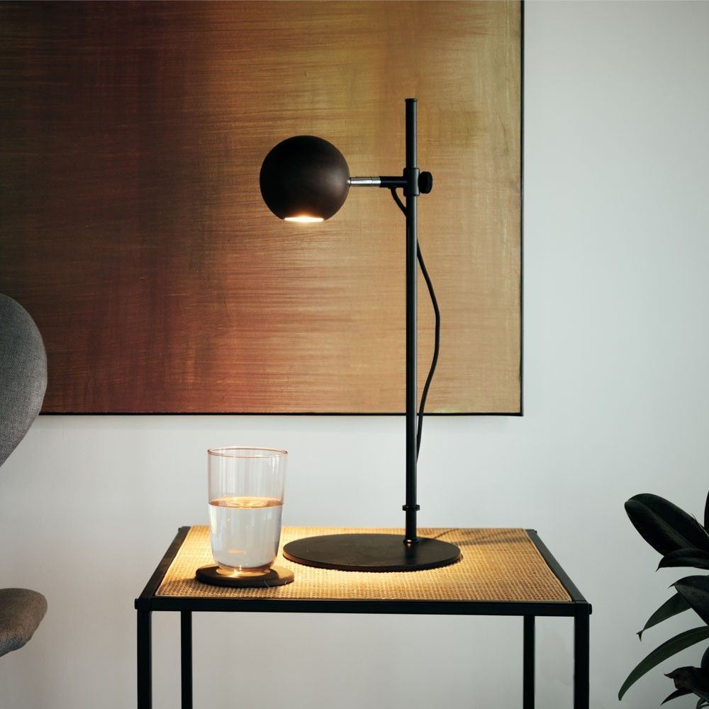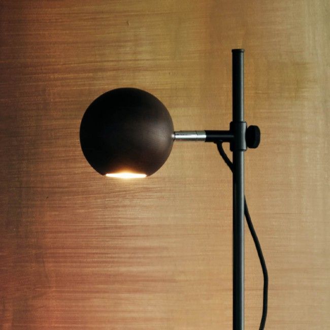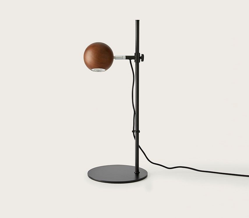 Лампа фокусного света с регулируемым плафоном и регулируемым по высоте . Его дизайн играет с прямыми и изогнутыми линиями, создавая баланс форм. Абажур из орехового дерева или окрашен в черный цвет, а конструкция из стали, покрытой матовым черным. Она идеально подходит для мест, где вам нужен сфокусированный свет, в местах для чтения или работы или в качестве лампы для прикроватной тумбочки.