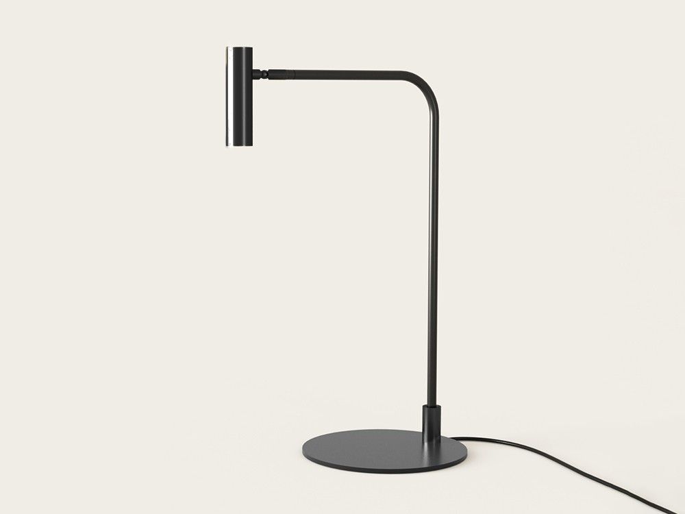 Настольная лампа Maho с матовым черным металлическим основанием и регулируемым металлическим плафоном в золотом или матовом черном цвете. С сенсорным регулятором на головке. Светодиод включен.