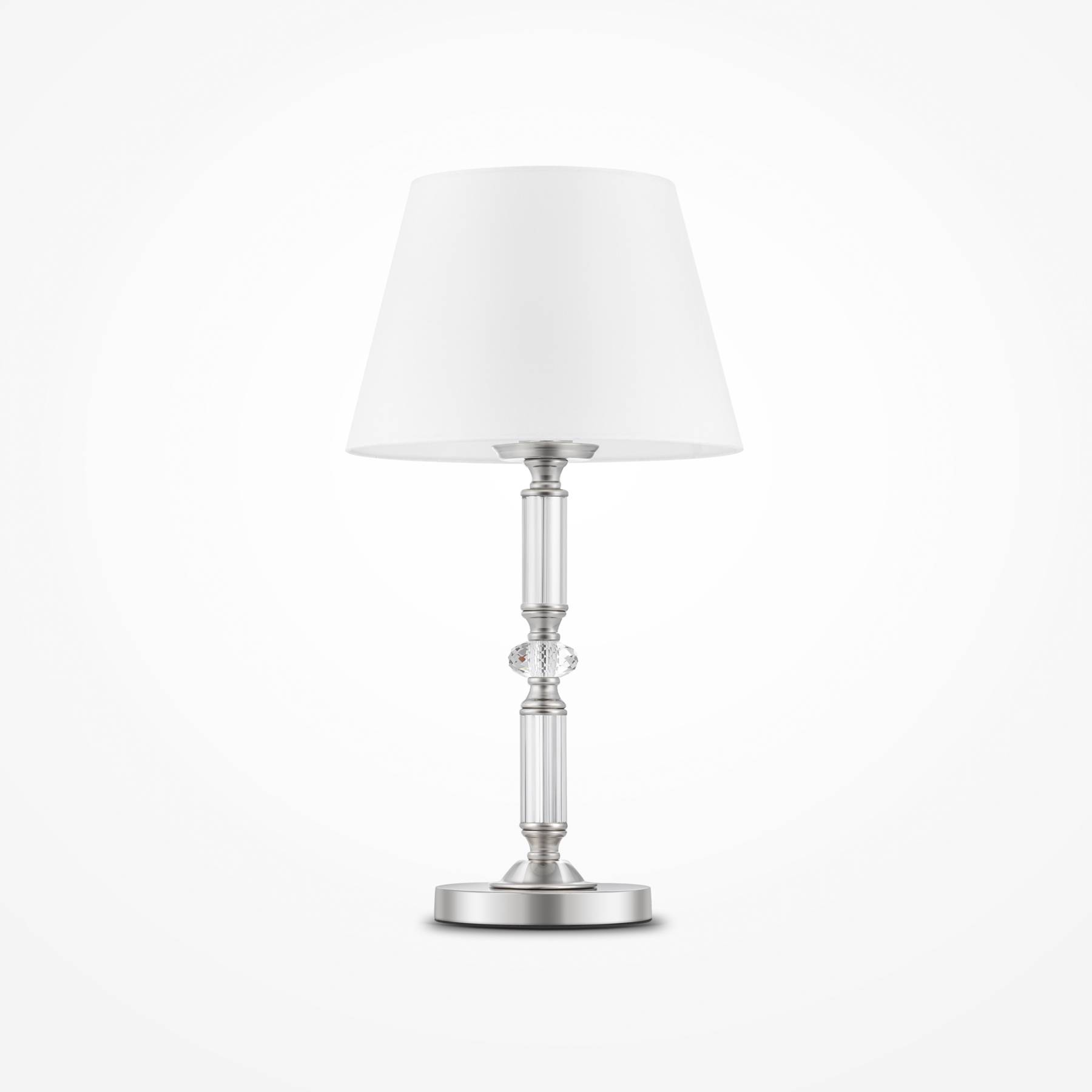 Материал арматуры – нержавеющая сталь, цвет – хром. Материал абажуров – текстиль на ПВХ, цвет – белый. Декор – прозрачное стекло. Акцентные стеклянные кристаллы на рожках со сложной огранкой.